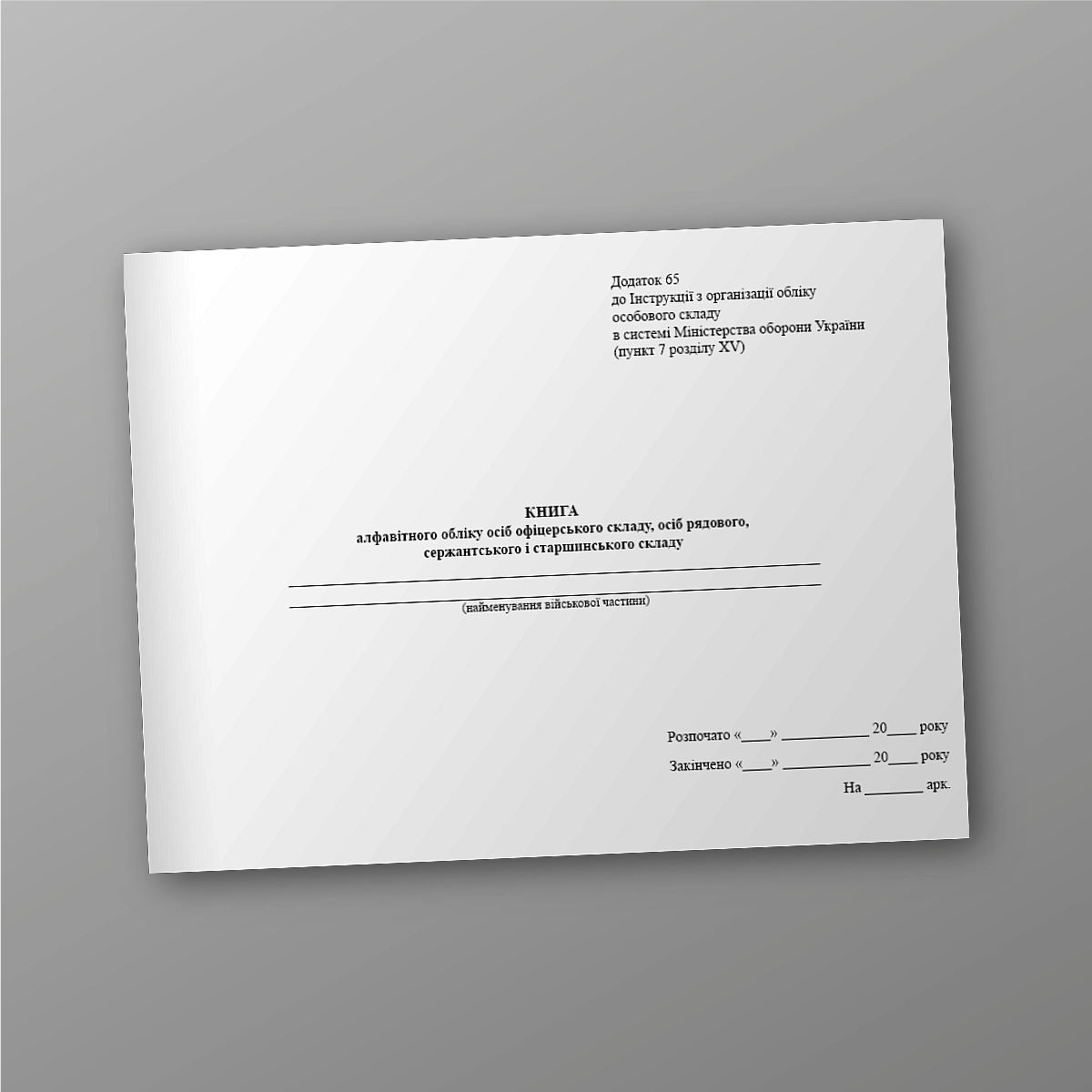 Журнал або книга військового, медичного обліку може бути виконана в м'якій або твердій обкладинці. Якщо Ви не знайшли потрібну книгу обліку для ЗСУ, МВС або кількість сторінок потрібно зробити під ваше завдання,напишіть нам на e-mail [email protected], і ми обов'язково зв'яжемося з Вами.