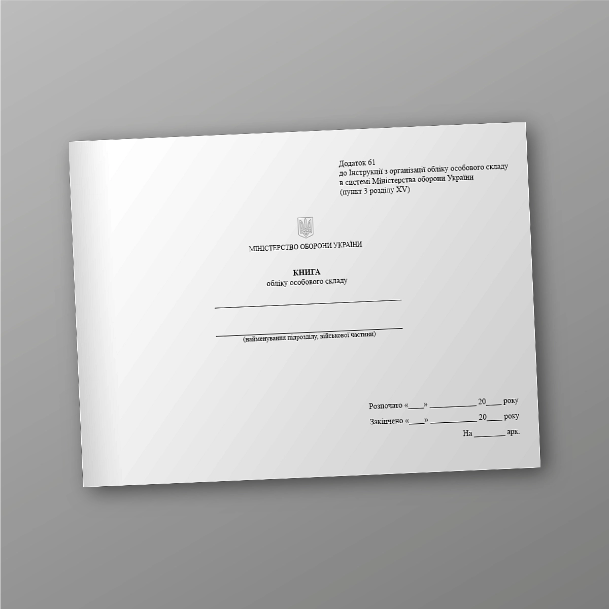 Журнал або книга військового, медичного обліку може бути виконана в м'якій або твердій обкладинці. Якщо Ви не знайшли потрібну книгу обліку для ЗСУ, МВС або кількість сторінок потрібно зробити під ваше завдання,напишіть нам на e-mail [email protected], і ми обов'язково зв'яжемося з Вами.