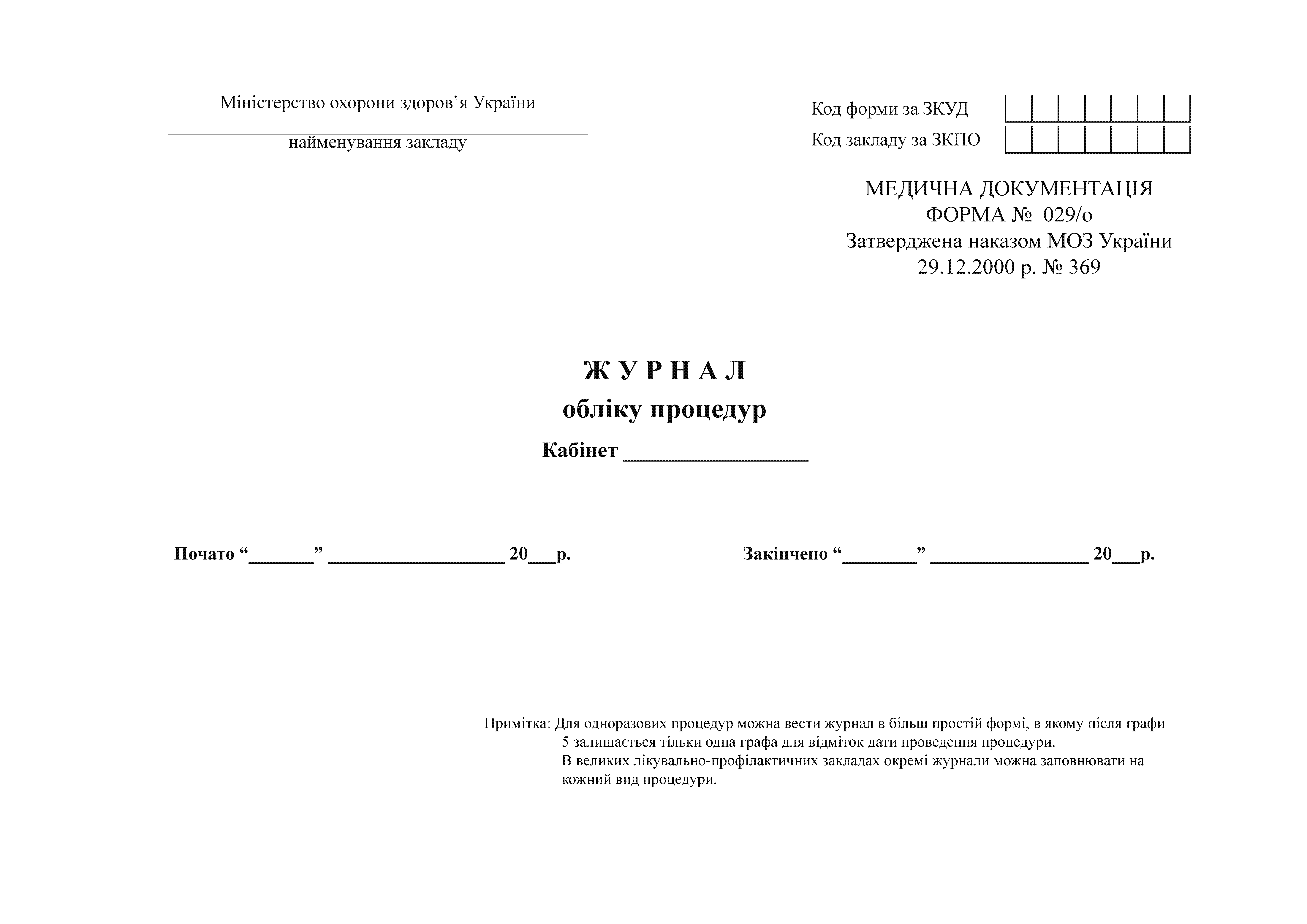 Медична документація Форма №029/о Затверджена наказом МОЗ України 29.12.2000 р. №369.