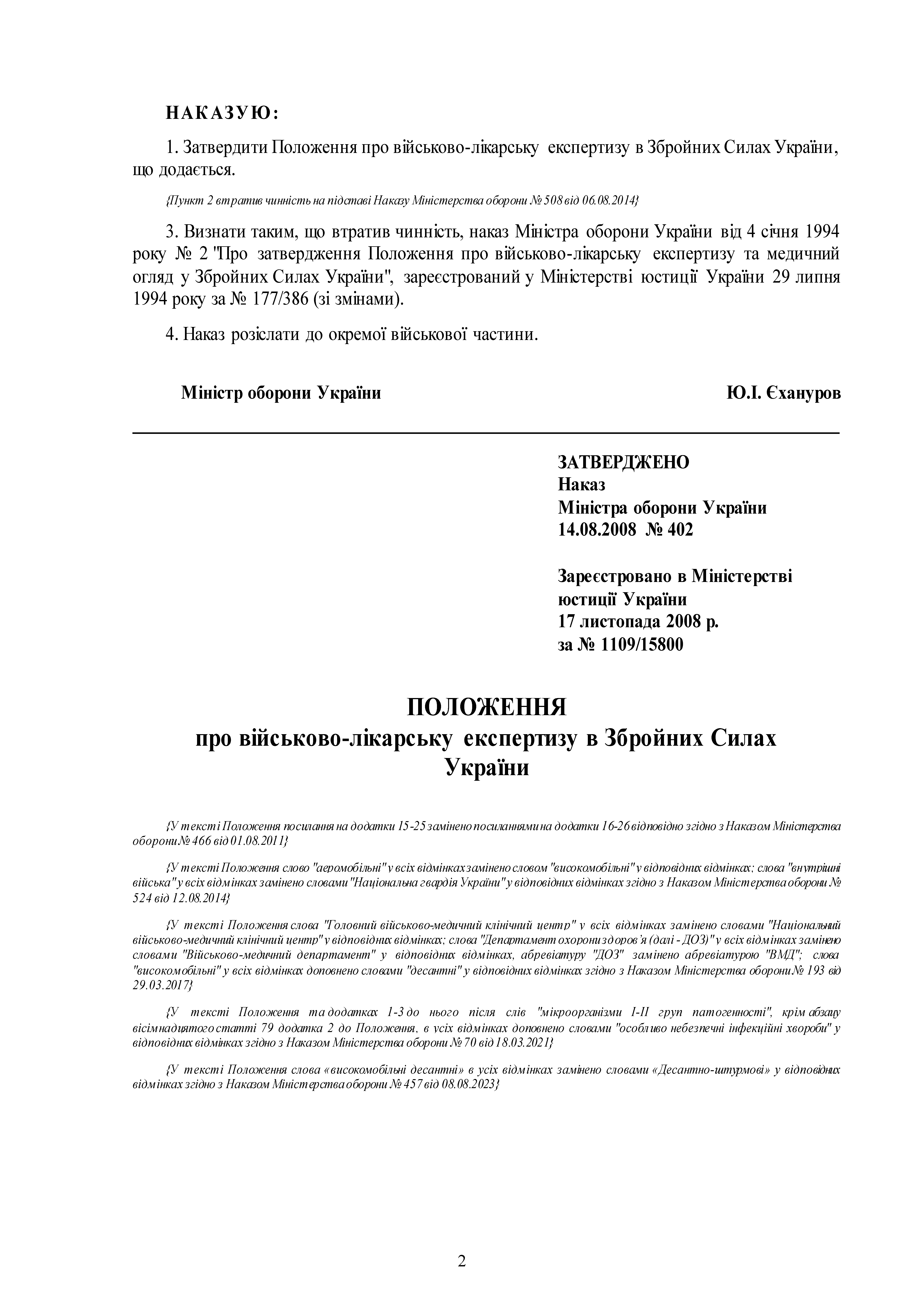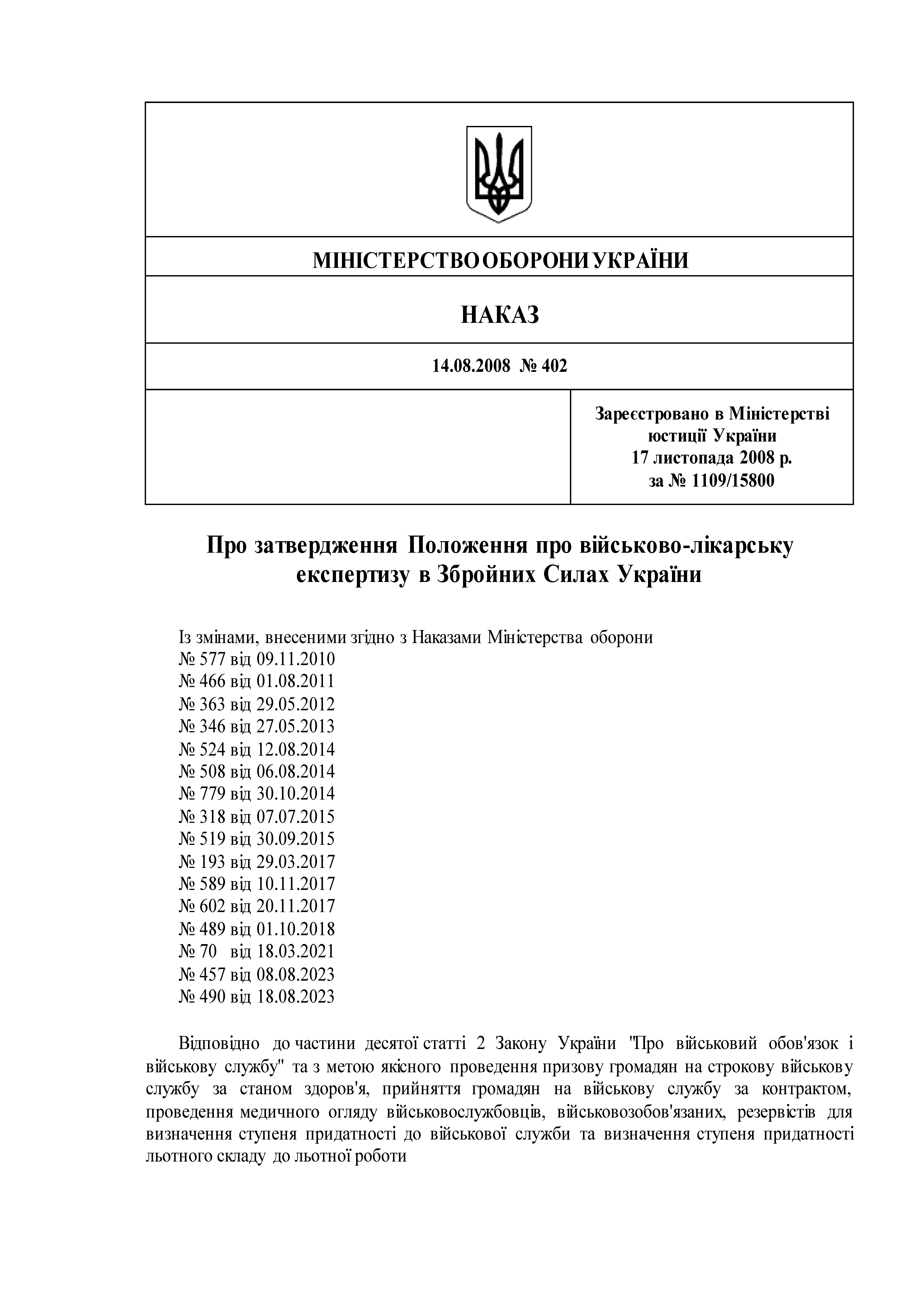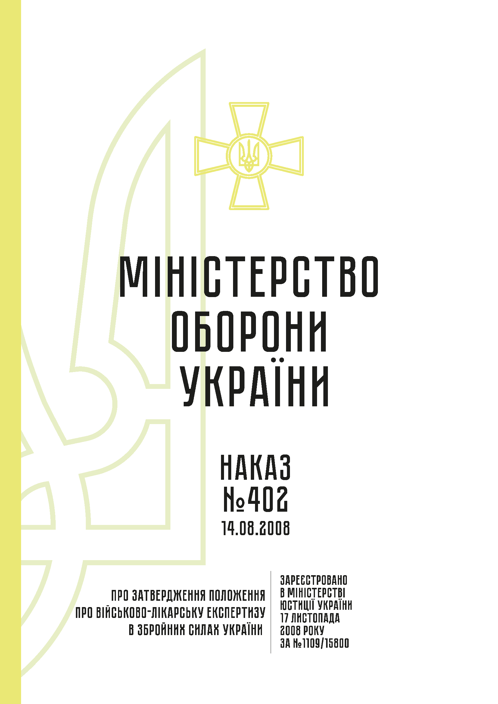 Наказ 402 + Додатки. Про затвердження Положення про військово-лікарську експертизу в Збройних Силах України.