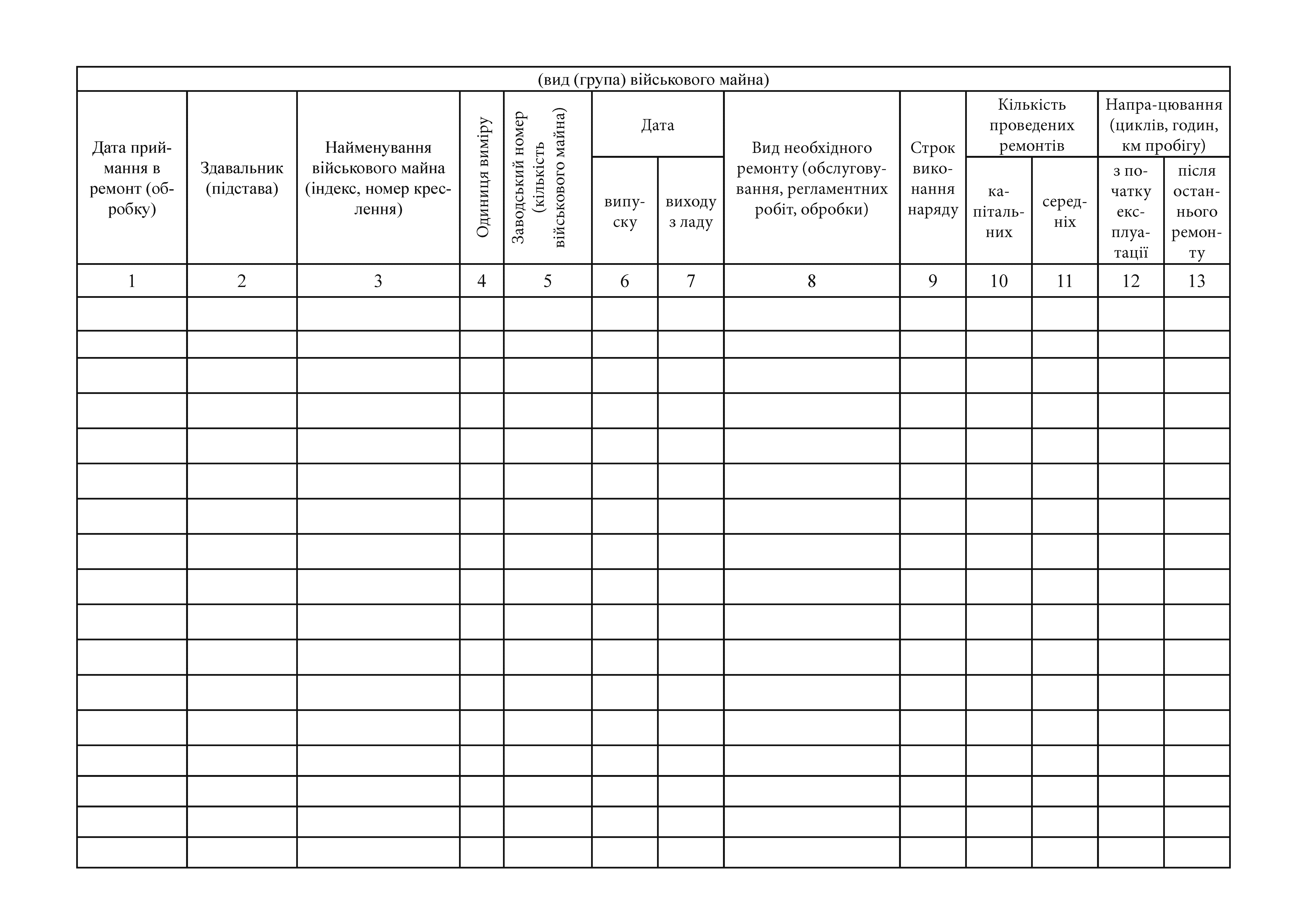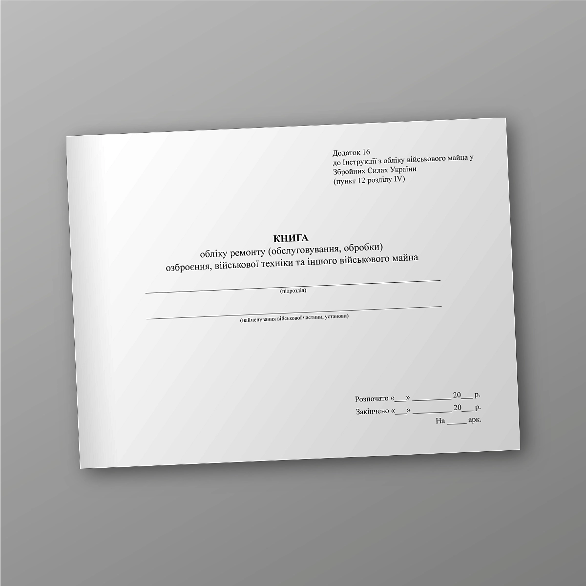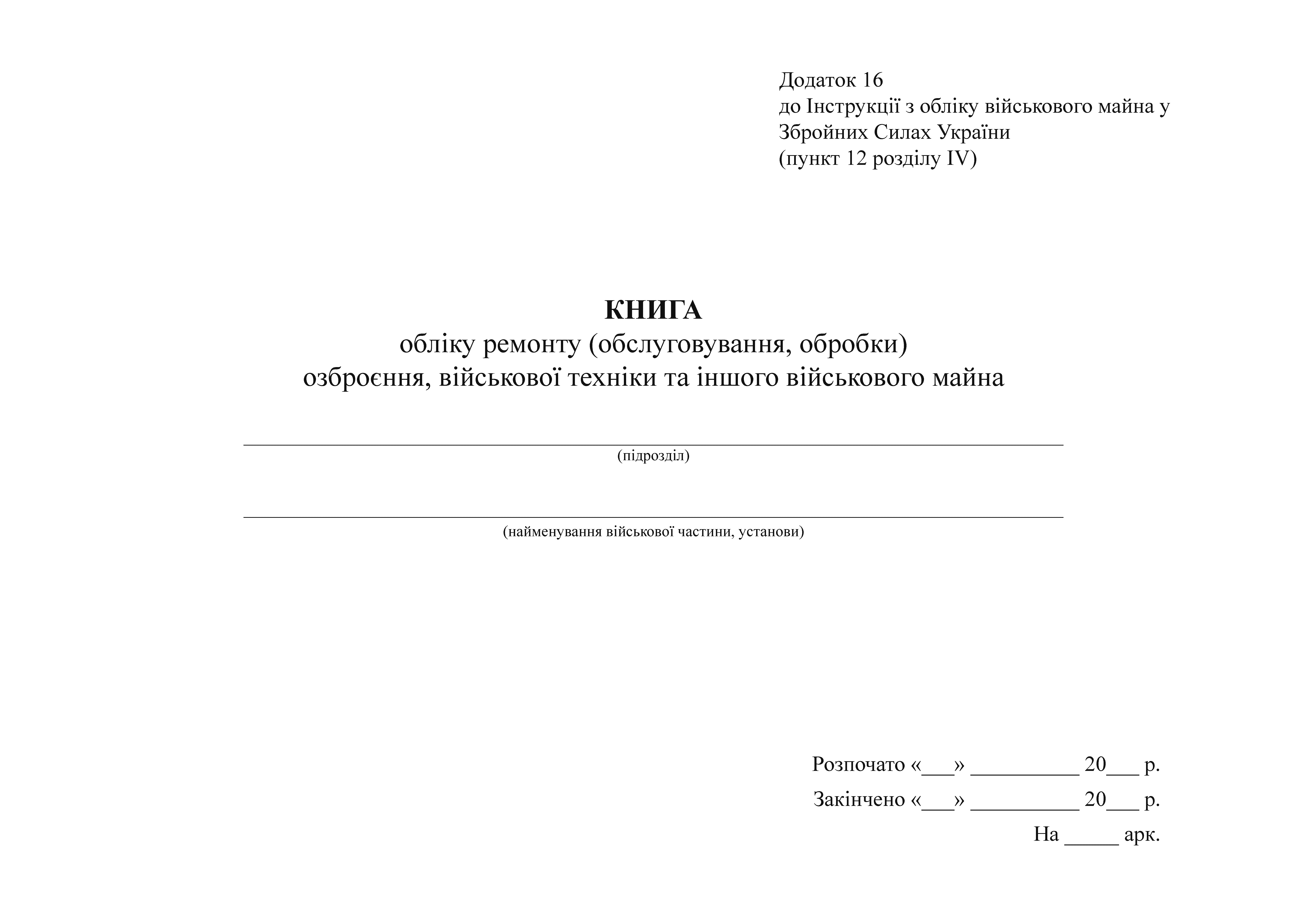 Книгу обліку ремонту (обслуговування обробки) озброєння, військової техніки та іншого військового майна.