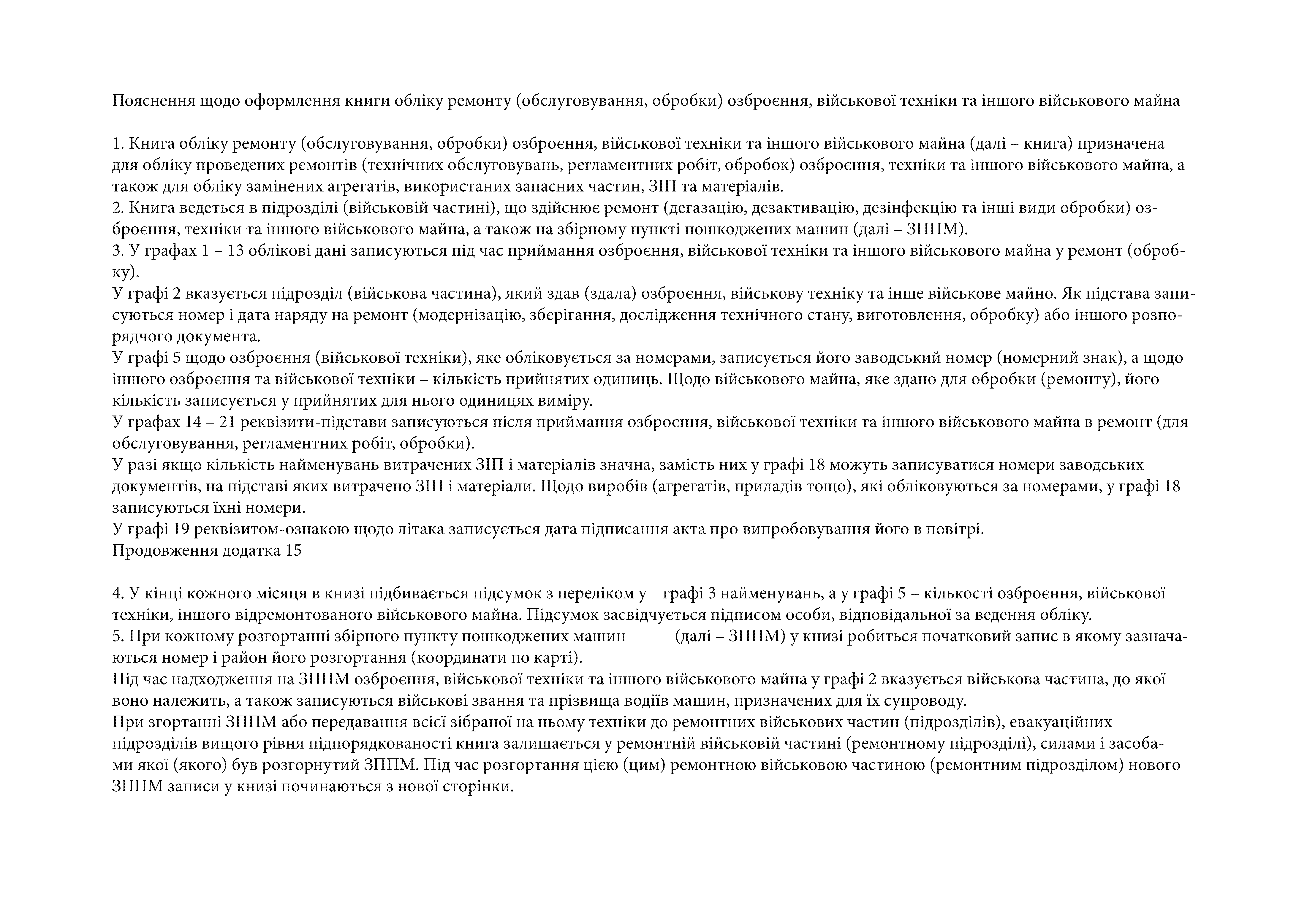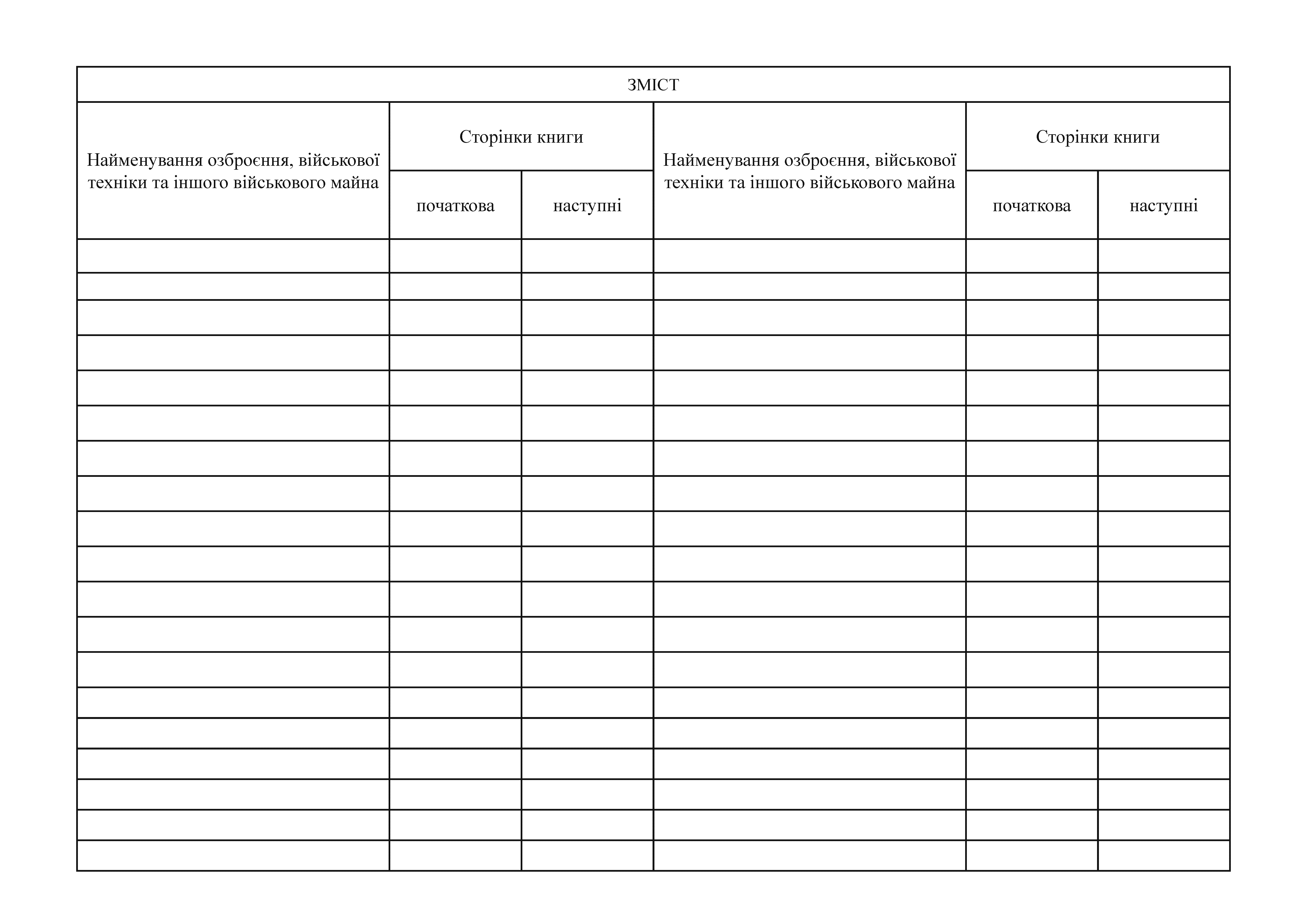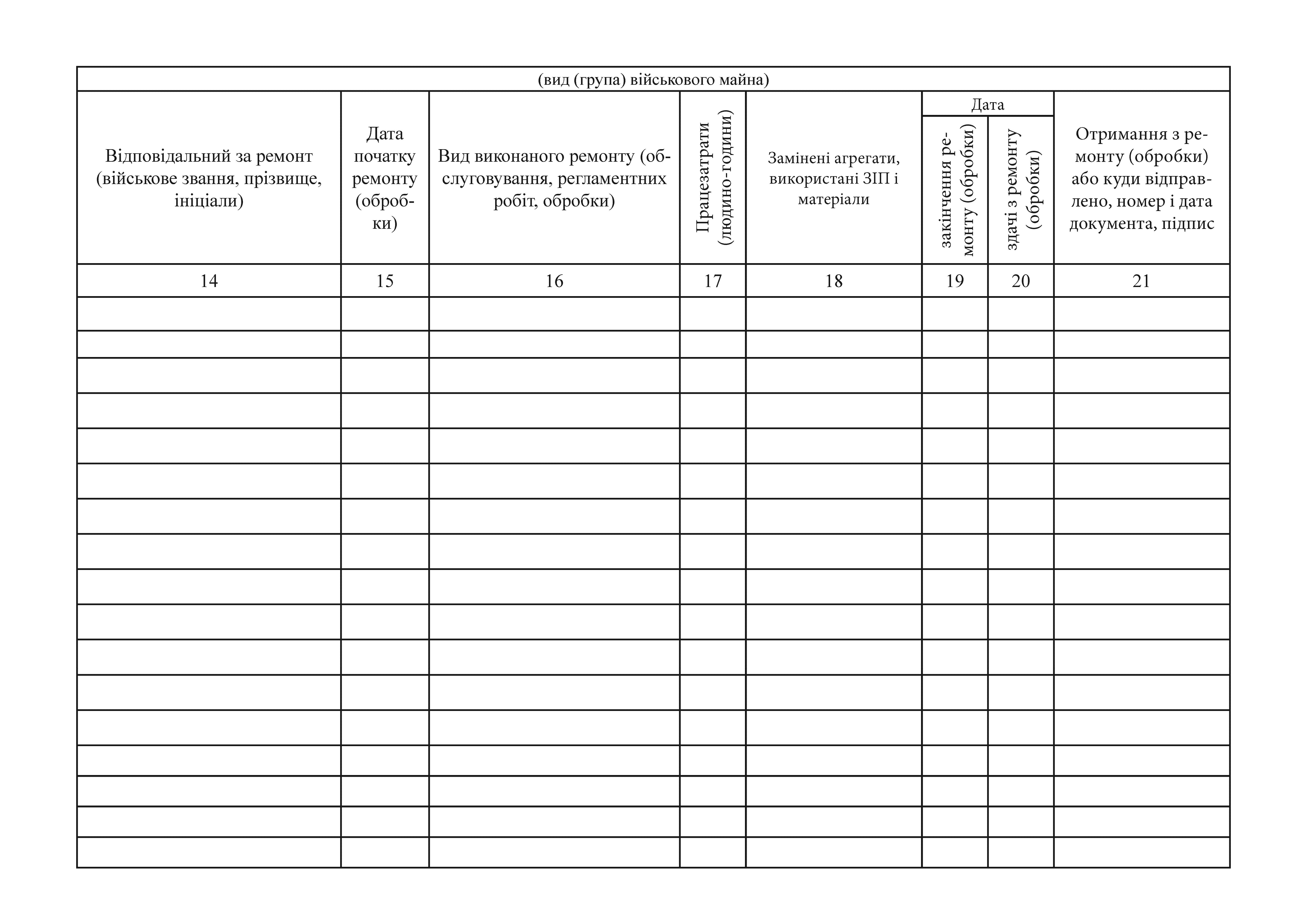 Книгу обліку ремонту (обслуговування обробки) озброєння, військової техніки та іншого військового майна.