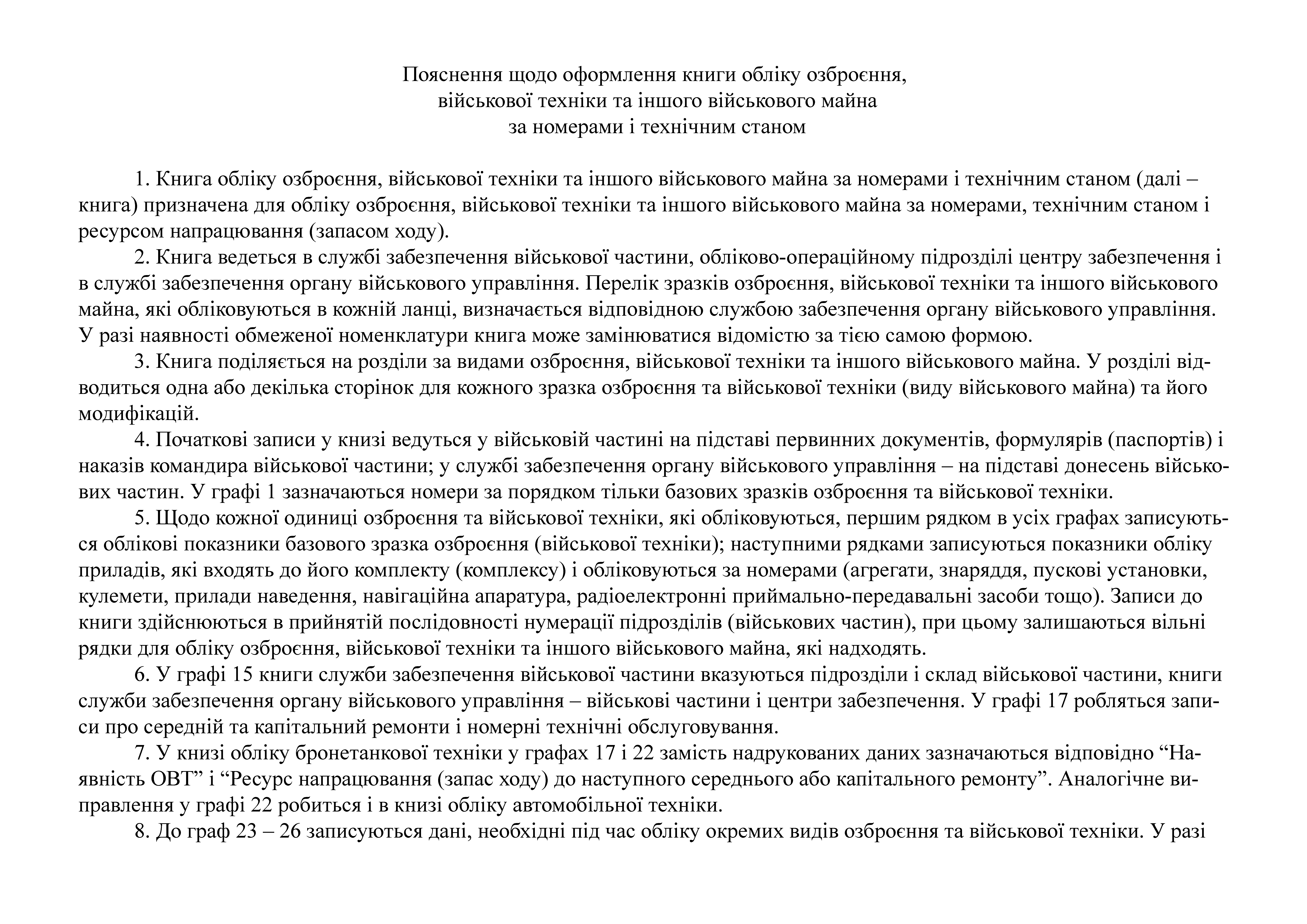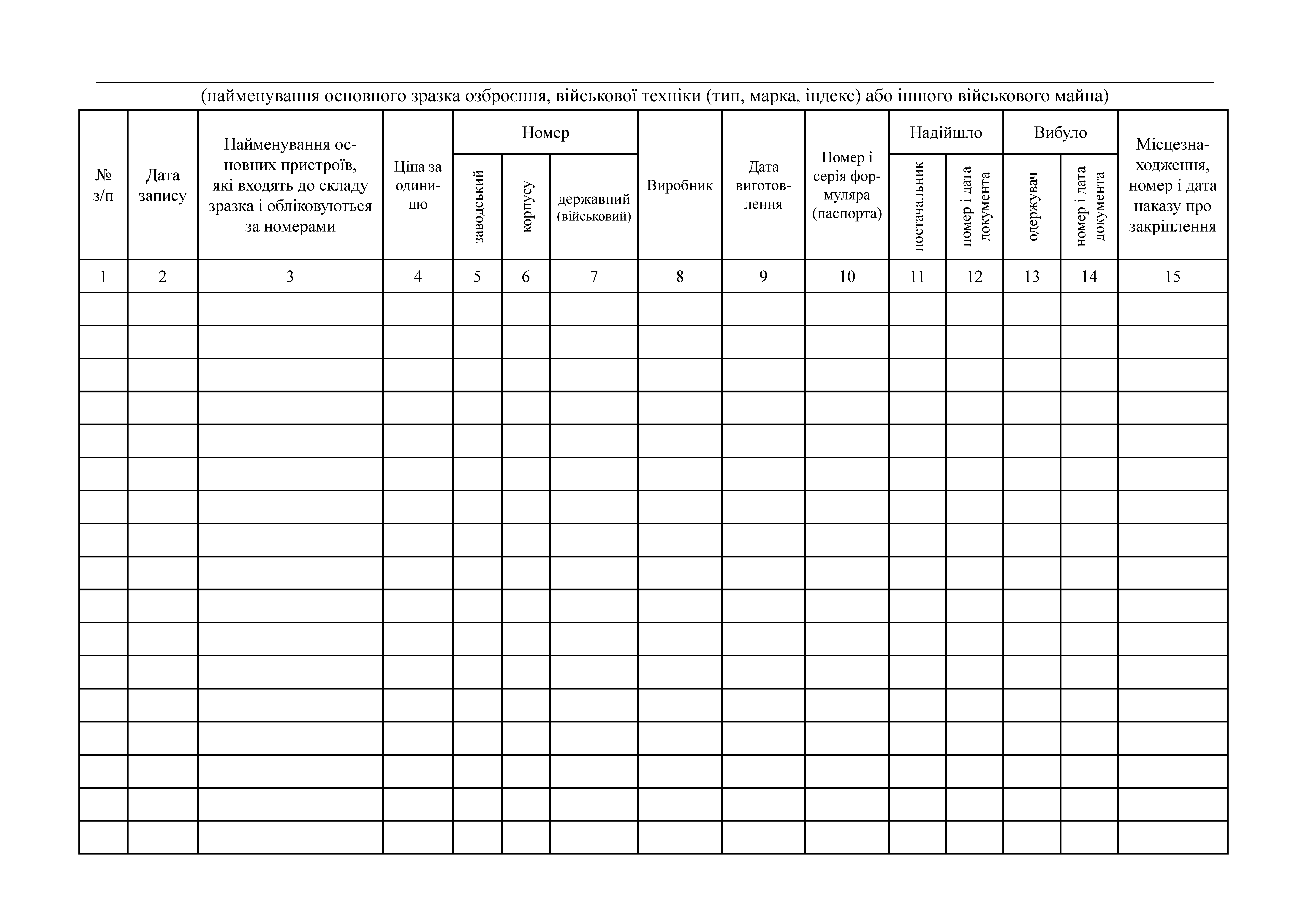 Книгу обліку озброєння військової техніки та іншого військового майна за номерами і технічним станом.