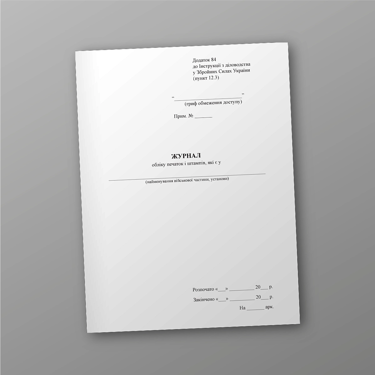 Журнал або книга військового, медичного обліку може бути виконана в м'якій або твердій обкладинці. Якщо Ви не знайшли потрібну книгу обліку для ЗСУ, МВС або кількість сторінок потрібно зробити під ваше завдання,напишіть нам на e-mail [email protected], і ми обов'язково зв'яжемося з Вами.