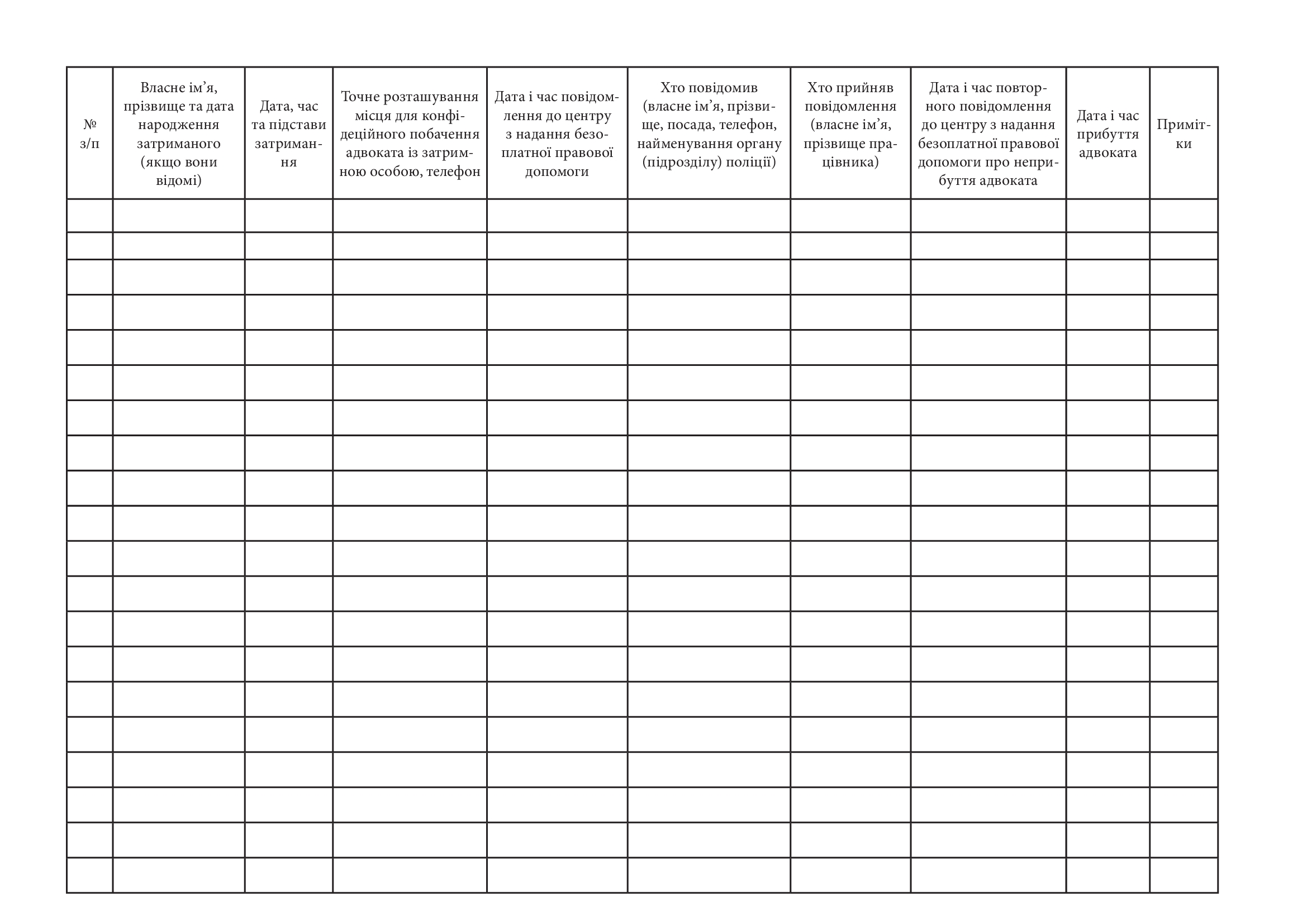 Журнал інформування центрів з надання безоплатної вторинної правової допомоги затриманим.