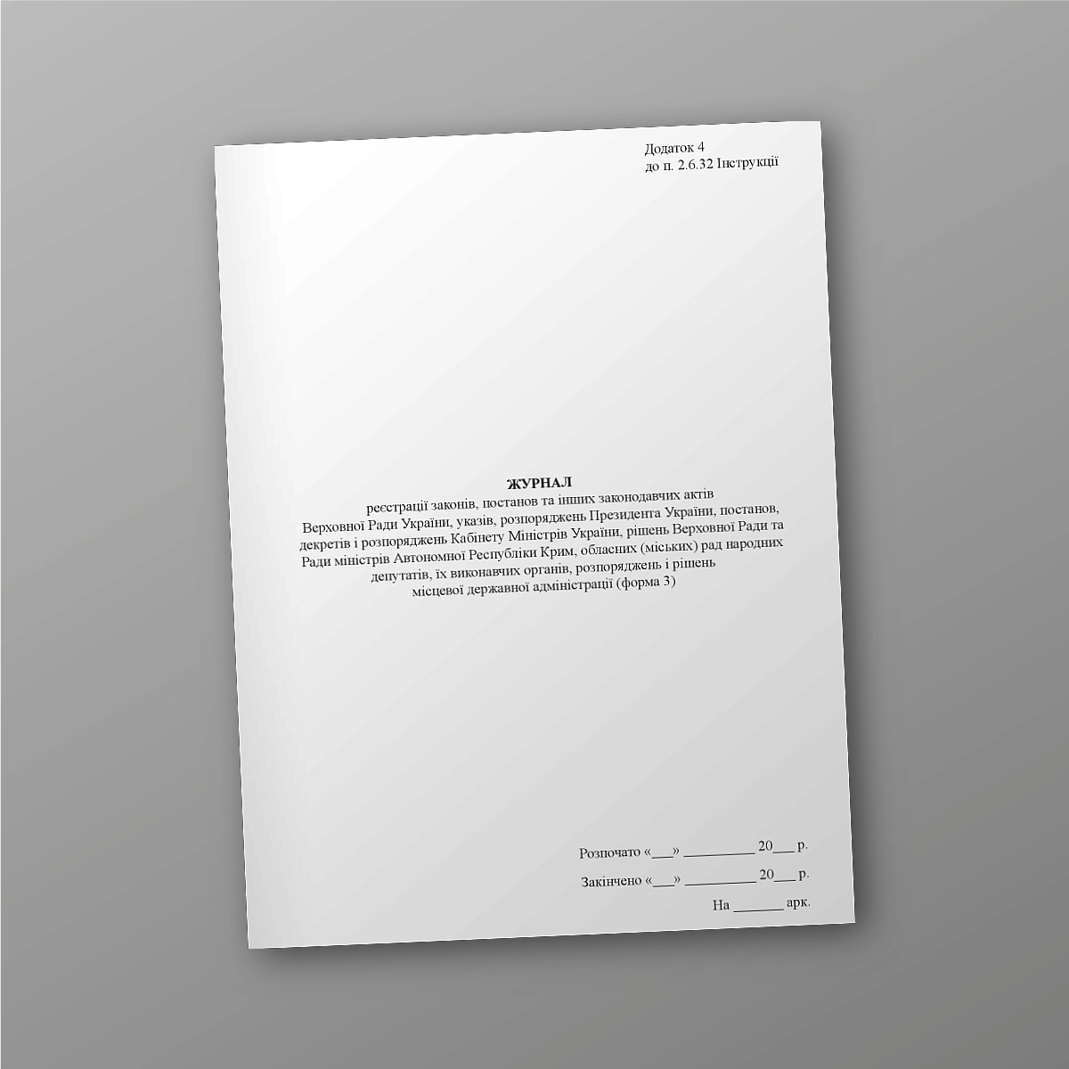 Купити Журнал реєстрації законів, постанов та інших законодавчих актів Верховної Ради України, указів, розпоряджень Президента України, постанов, декретів і розпоряджень Кабінету Міністрів України, рішень Верховної Ради та Ради міністрів Автономної Республіки Крим, обласних (міських) рад народних депутатів, їх виконавчих органів, розпоряджень і рішень місцевої державної адміністрації (форма 3).