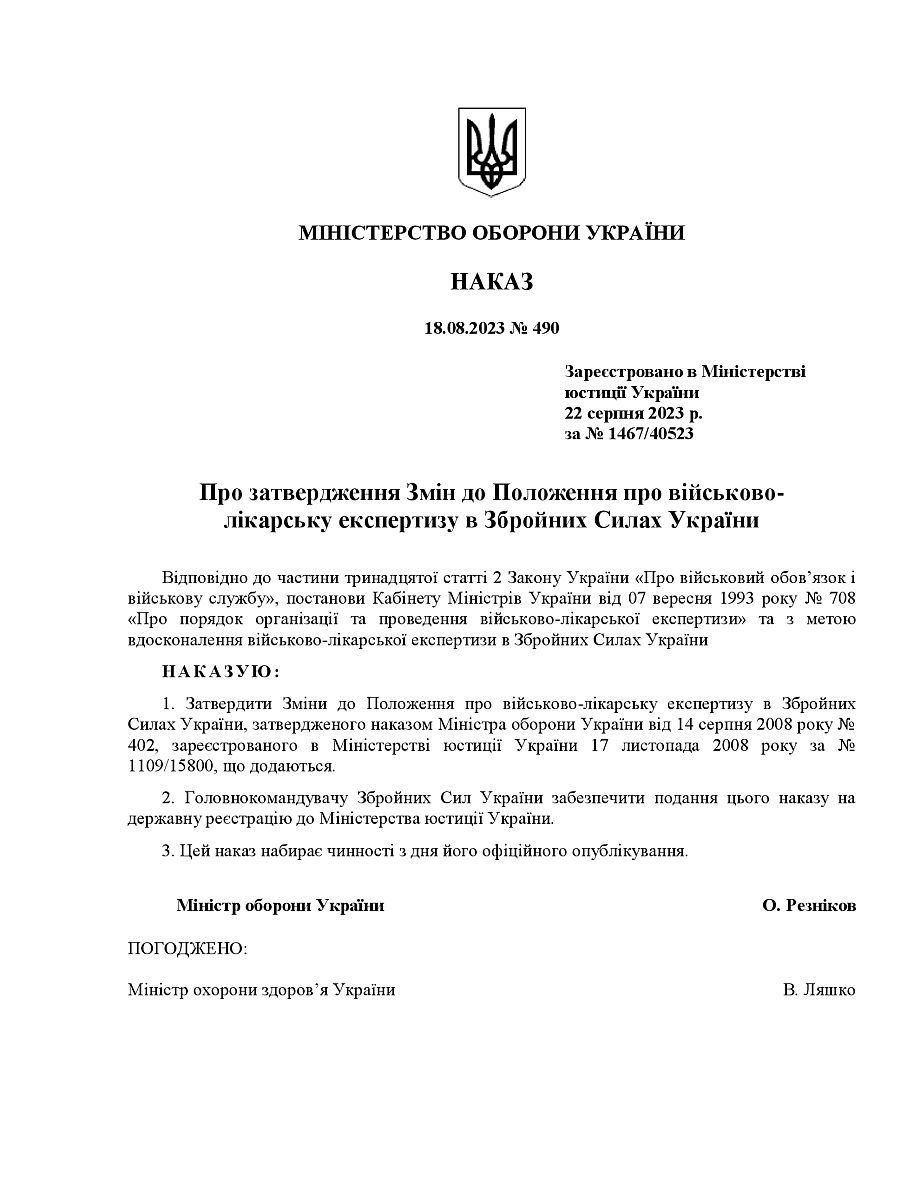 Наказ 490 + Додатки. Про затвердження Змін до Положення про військово-лікарську експертизу в Збройних Силах України.