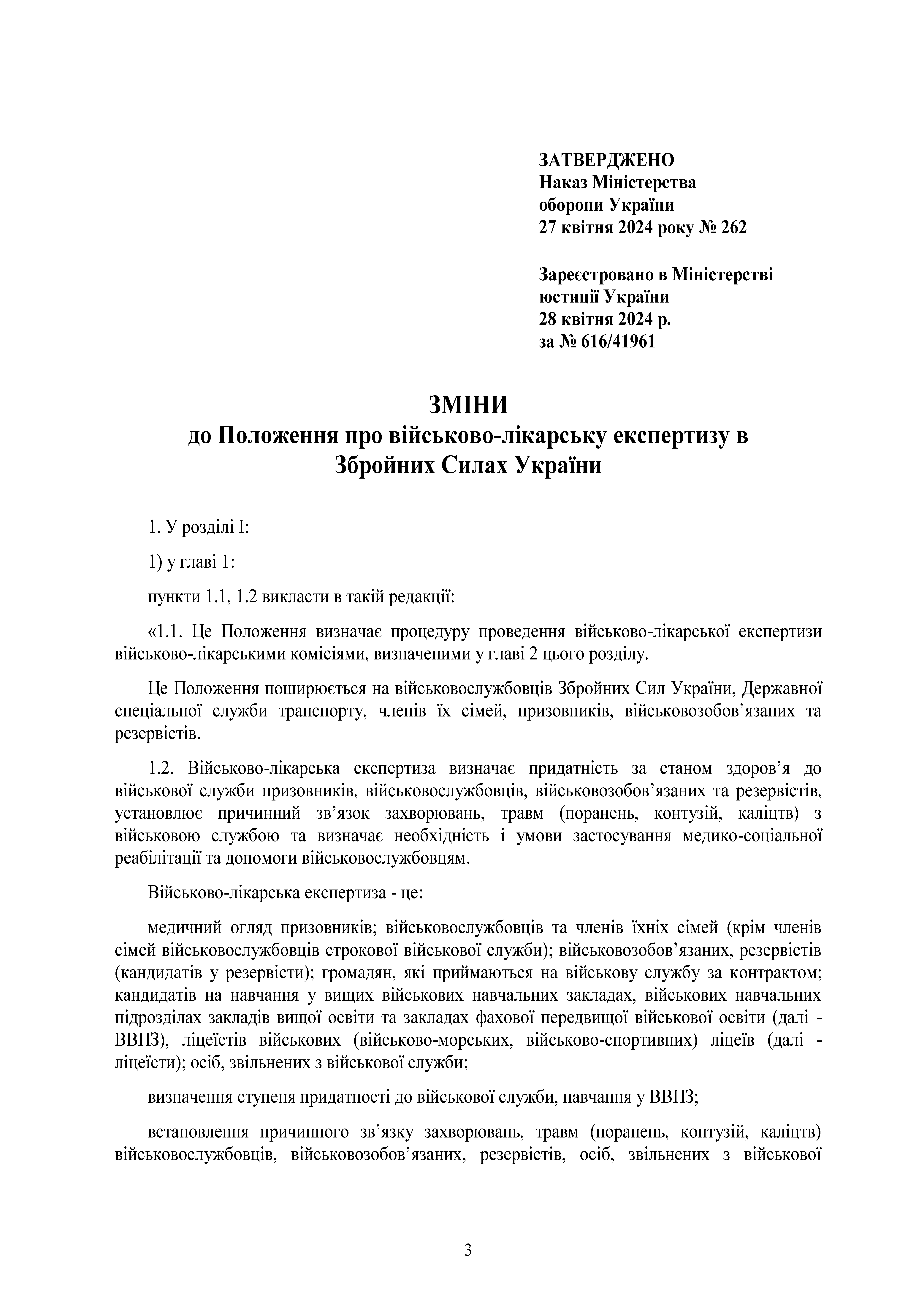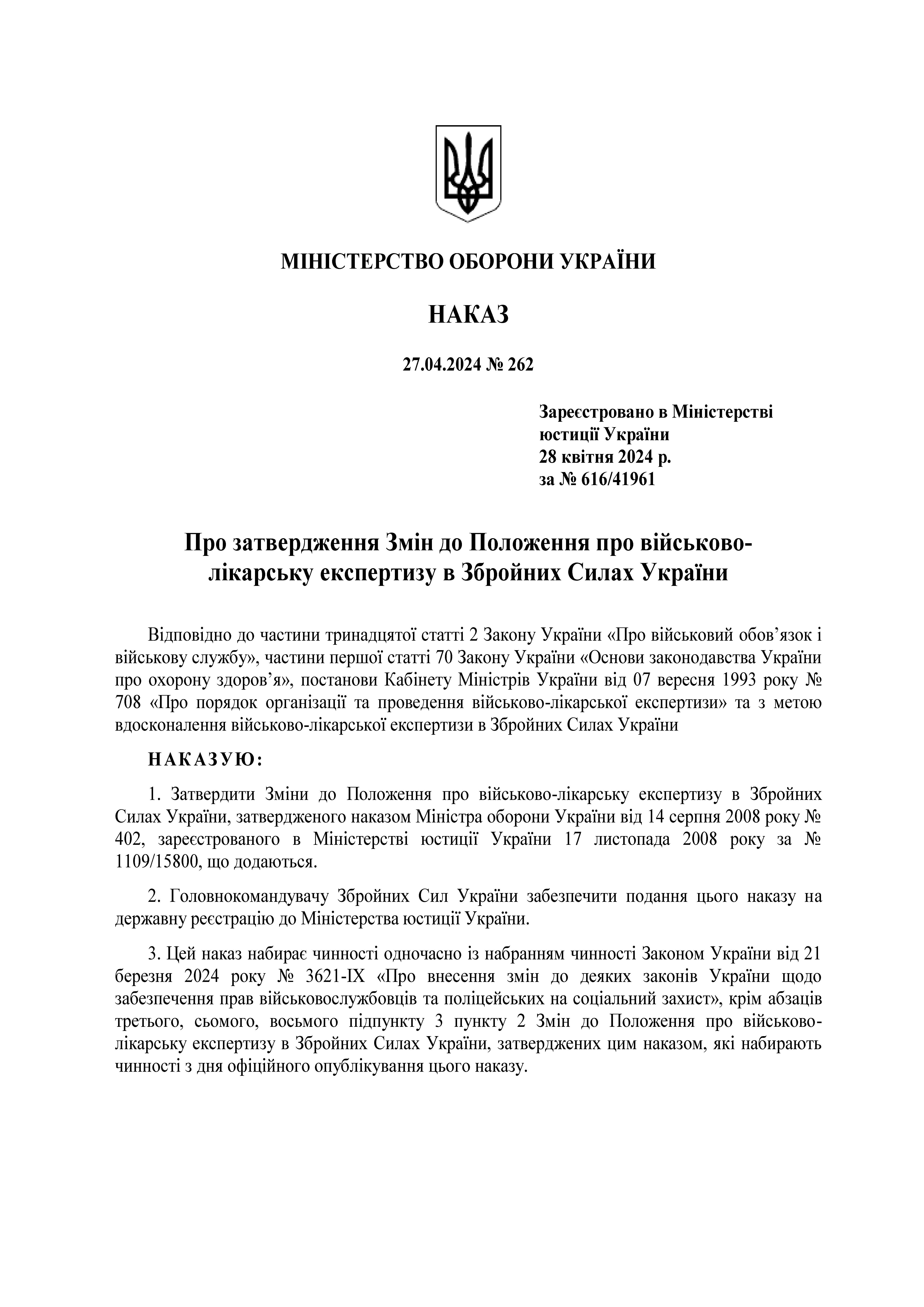 Наказ 262. Про затвердження Змін до Положення про військово-лікарську експертизу в Збройних Силах України.