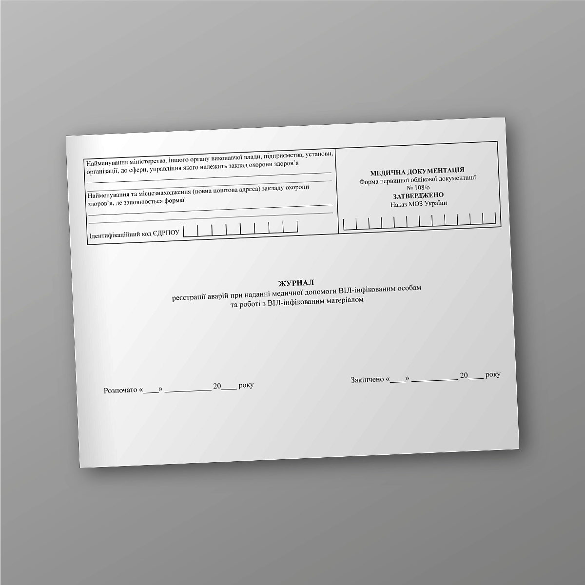 Журнал реєстрації аварій при наданні медичної допомоги ВІЛ-інфікованим особам та роботі з ВІЛ-інфікованим матеріалом Форма 108/о.