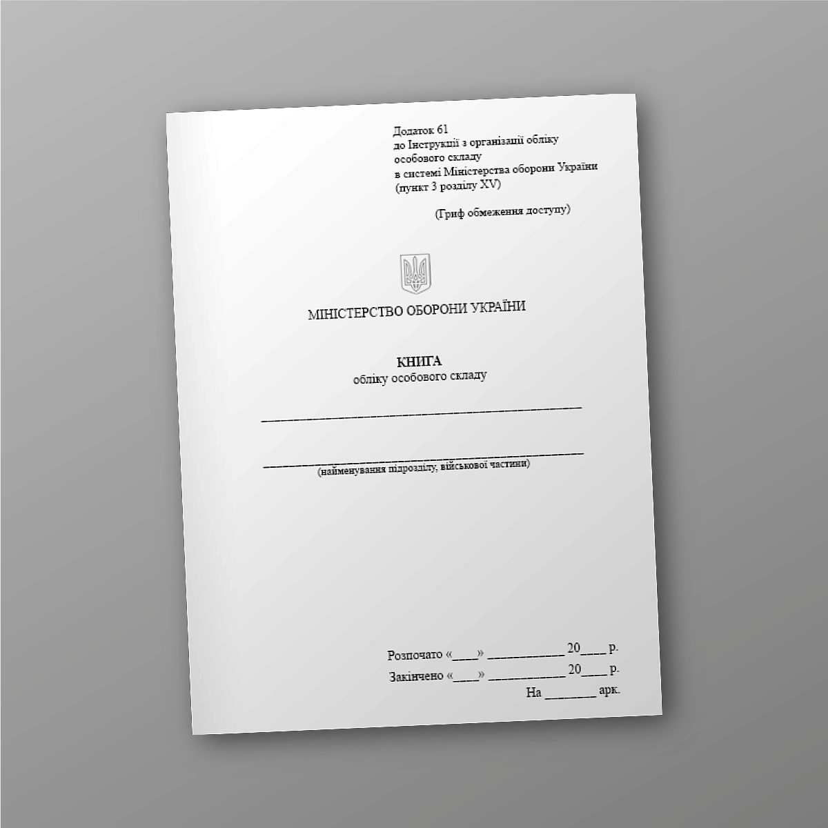 Журнал або книга військового, медичного обліку може бути виконана в м'якій або твердій обкладинці. Якщо Ви не знайшли потрібну книгу обліку для ЗСУ, МВС або кількість сторінок потрібно зробити під ваше завдання, напишіть нам на е-мейл [email protected], і ми обов’язково з Вами зв’яжемося.