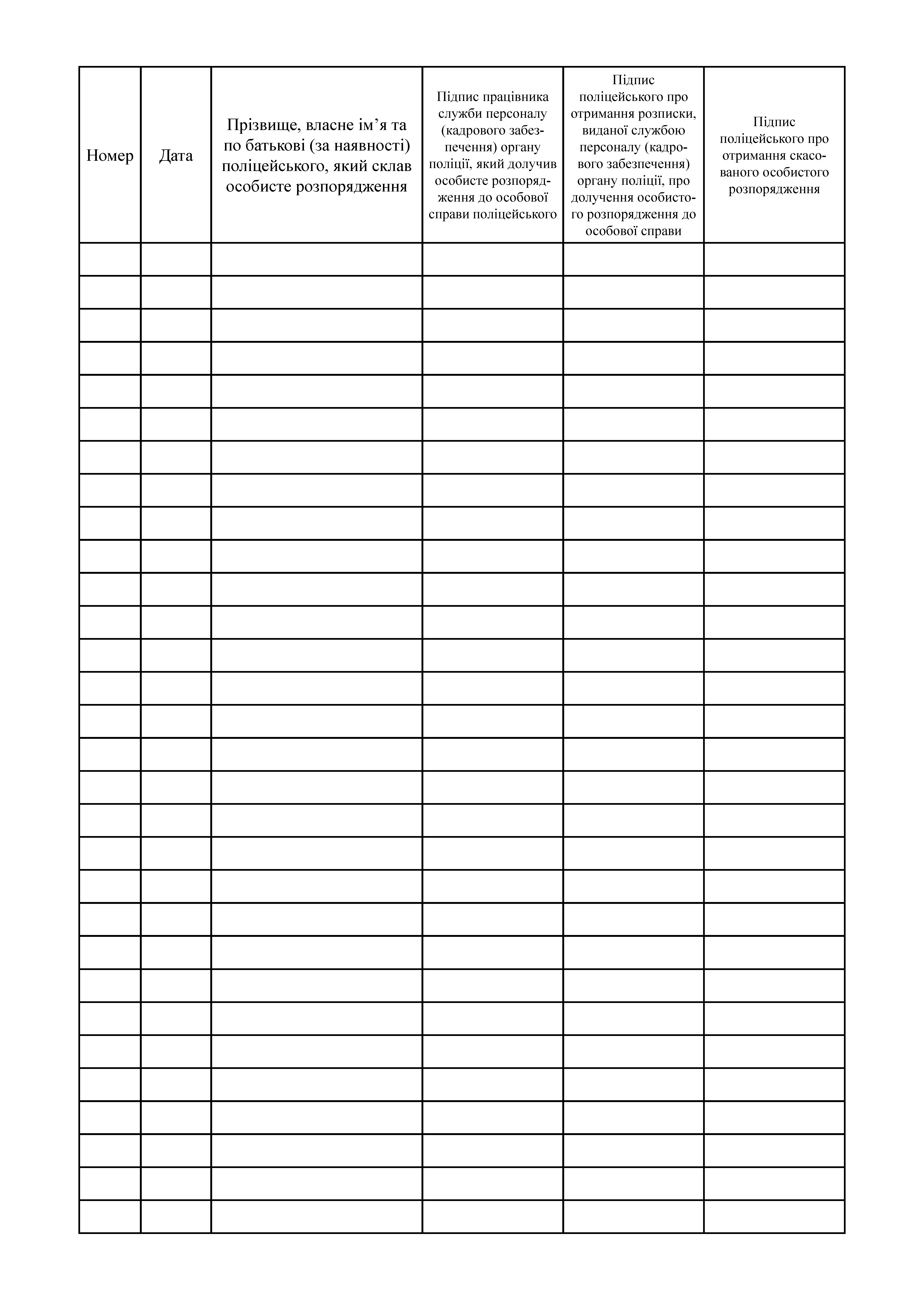 Журнал реєстрації особистих розпоряджень поліцейських, переданих на зберігання в особових справах.