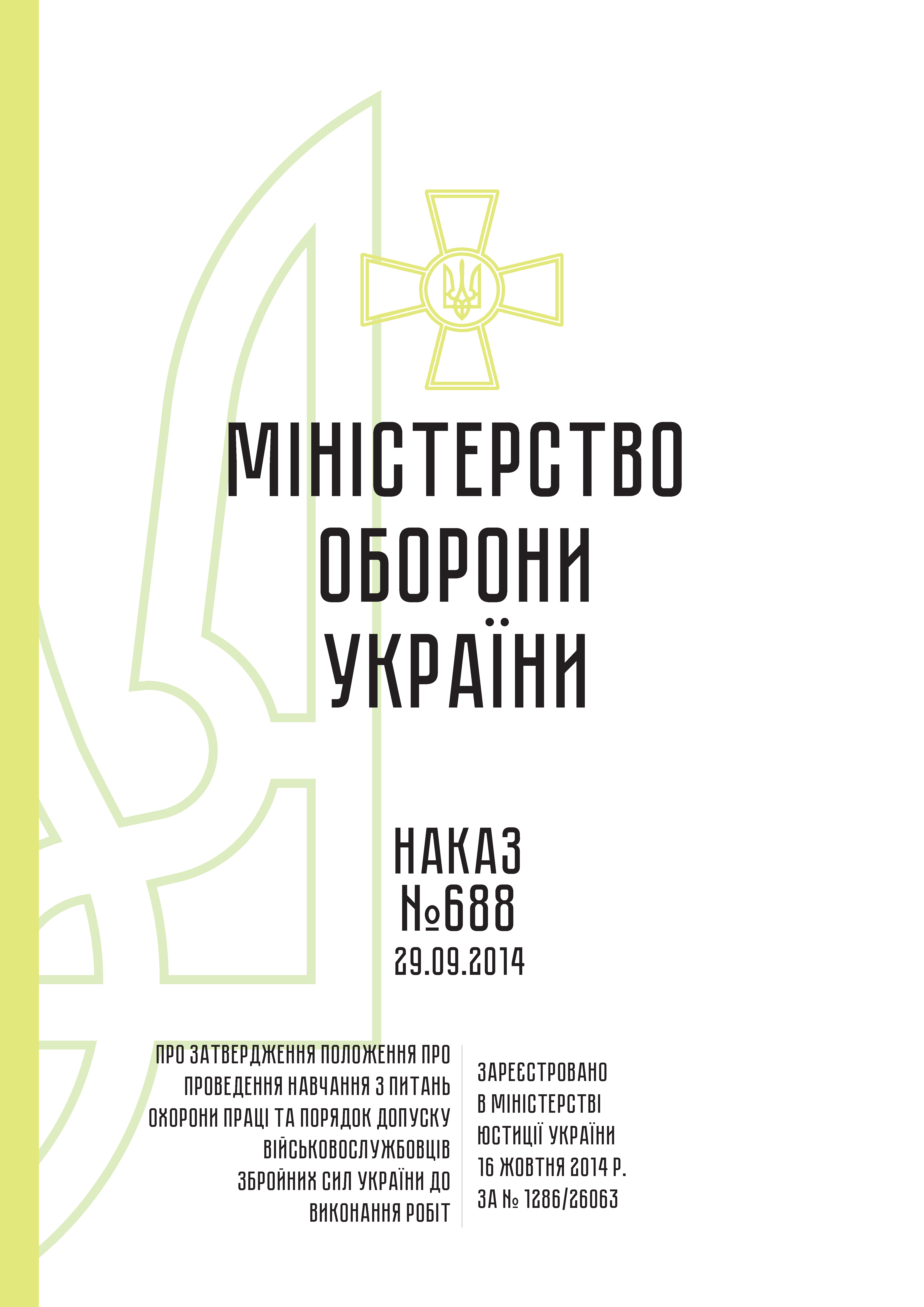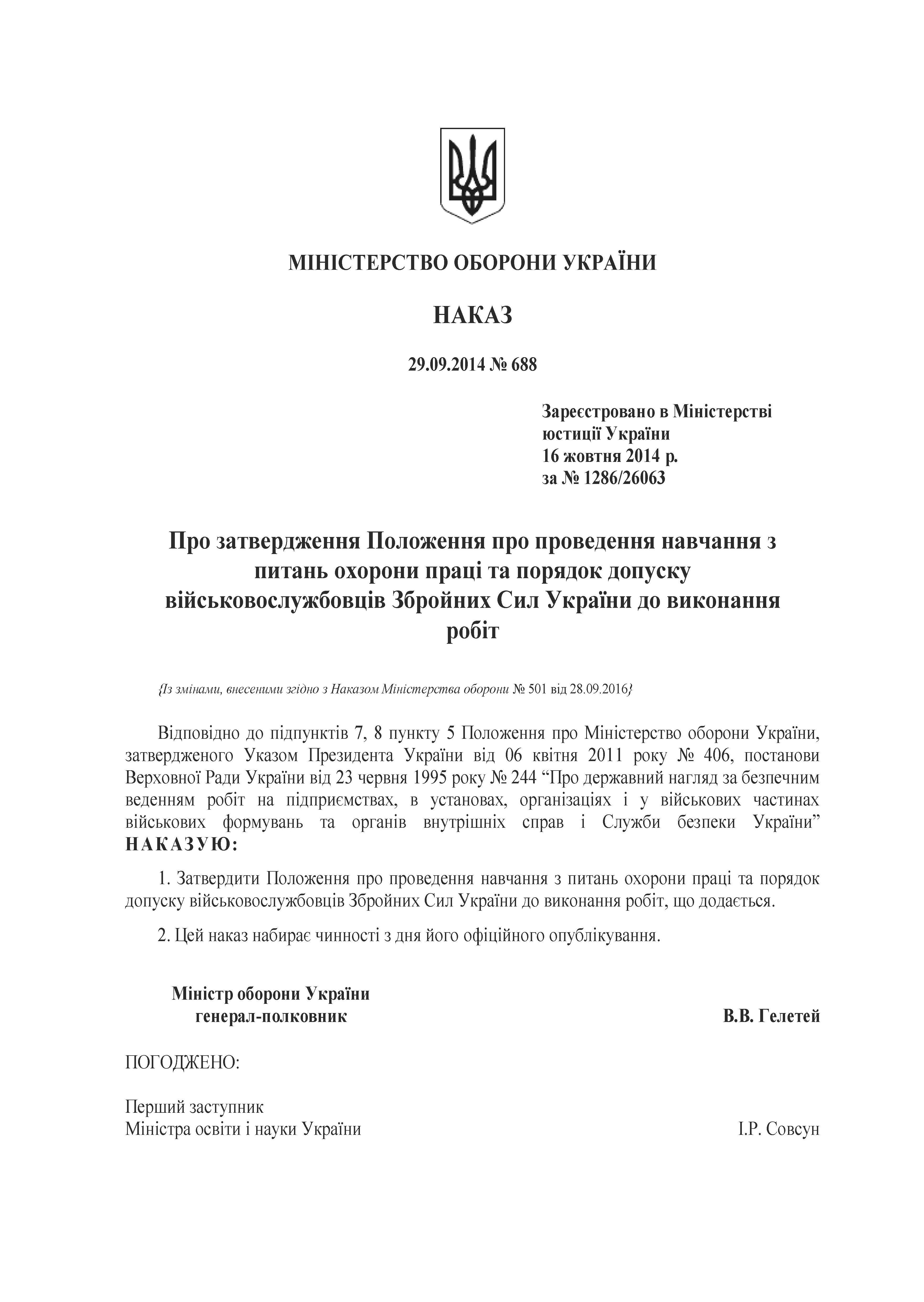 НАКАЗ Міністерства оборони України № 688 від 29.09.2014 "Про затвердження Положення про проведення навчання з питань охорони праці та порядок допуску військовослужбовців Збройних Сил України до виконання робіт".