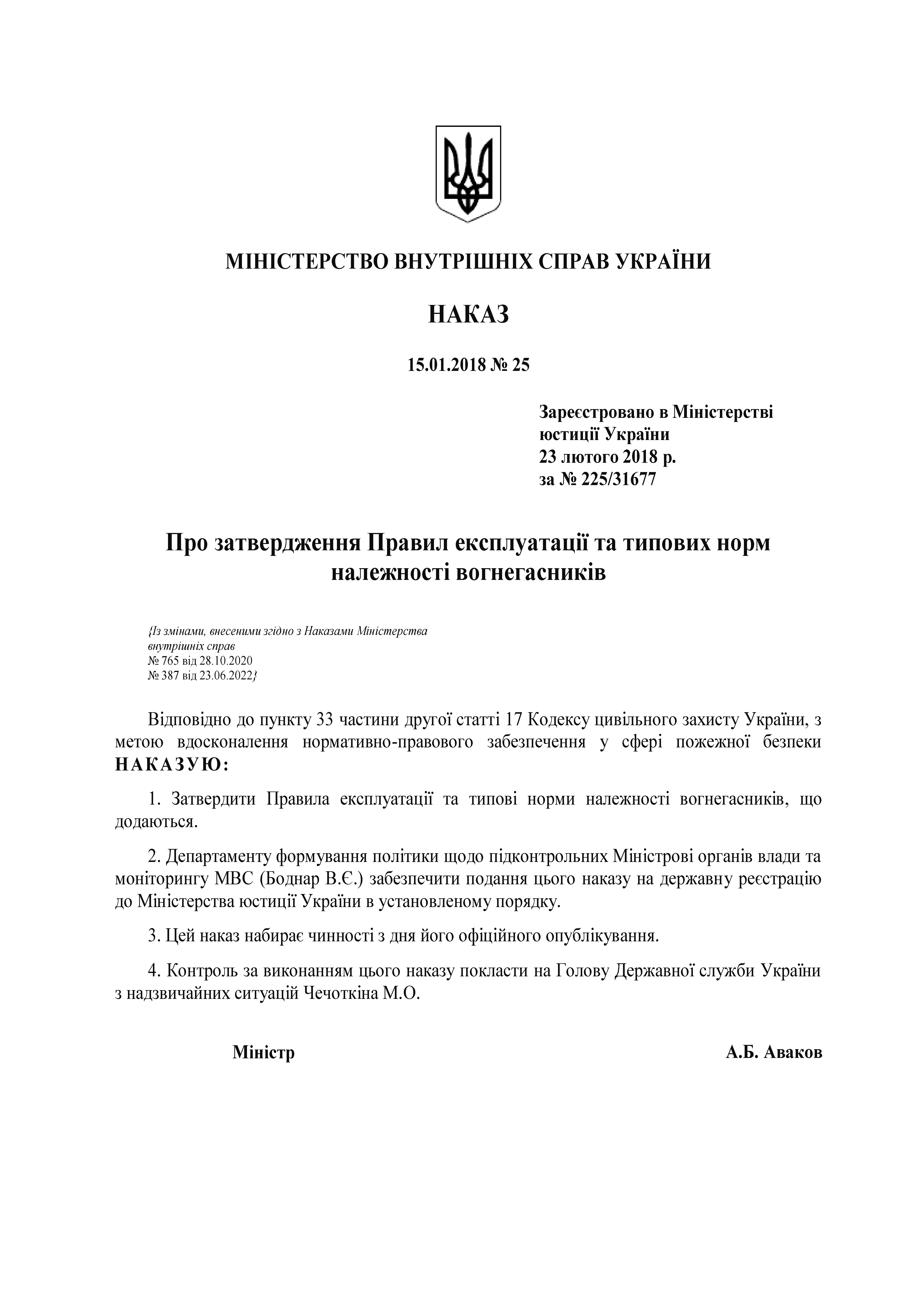 НАКАЗ Міністерство внутрішніх справ України № 25 "Про затвердження Правил експлуатації та типових норм належності вогнегасників".
