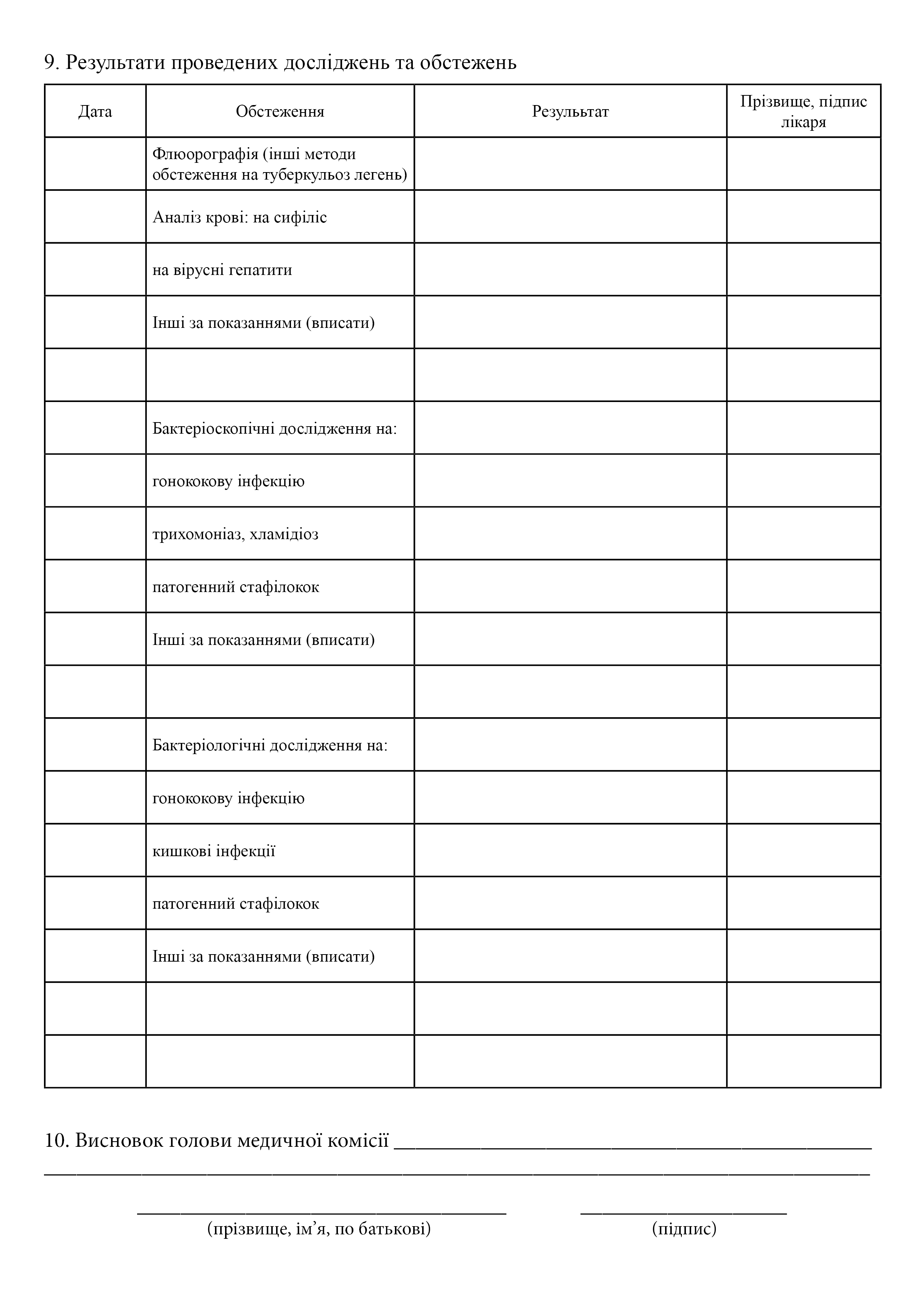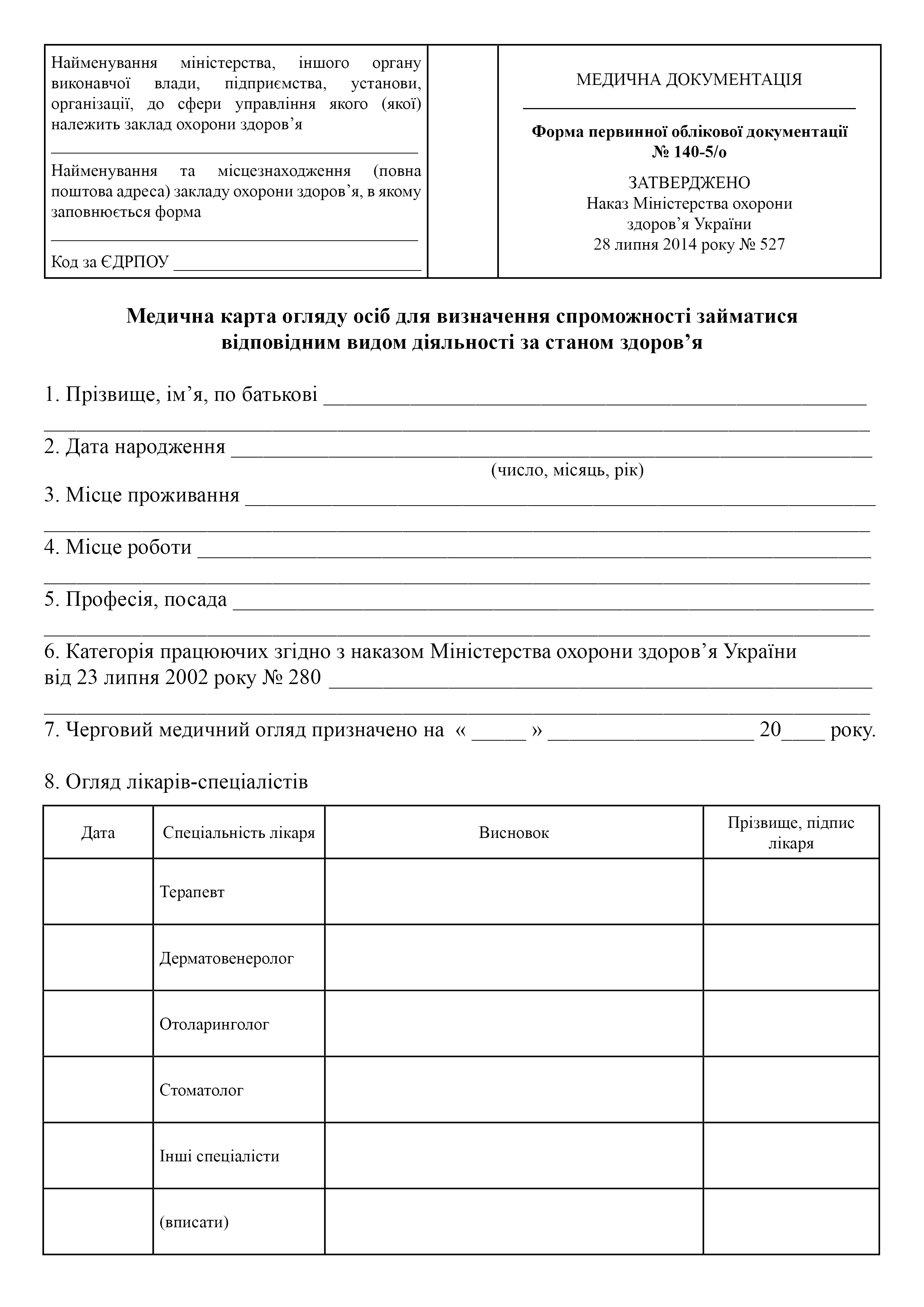 Медична карта огляду осіб для визначення спроможності займатися відповідним видом діяльності за станом здоров'я.