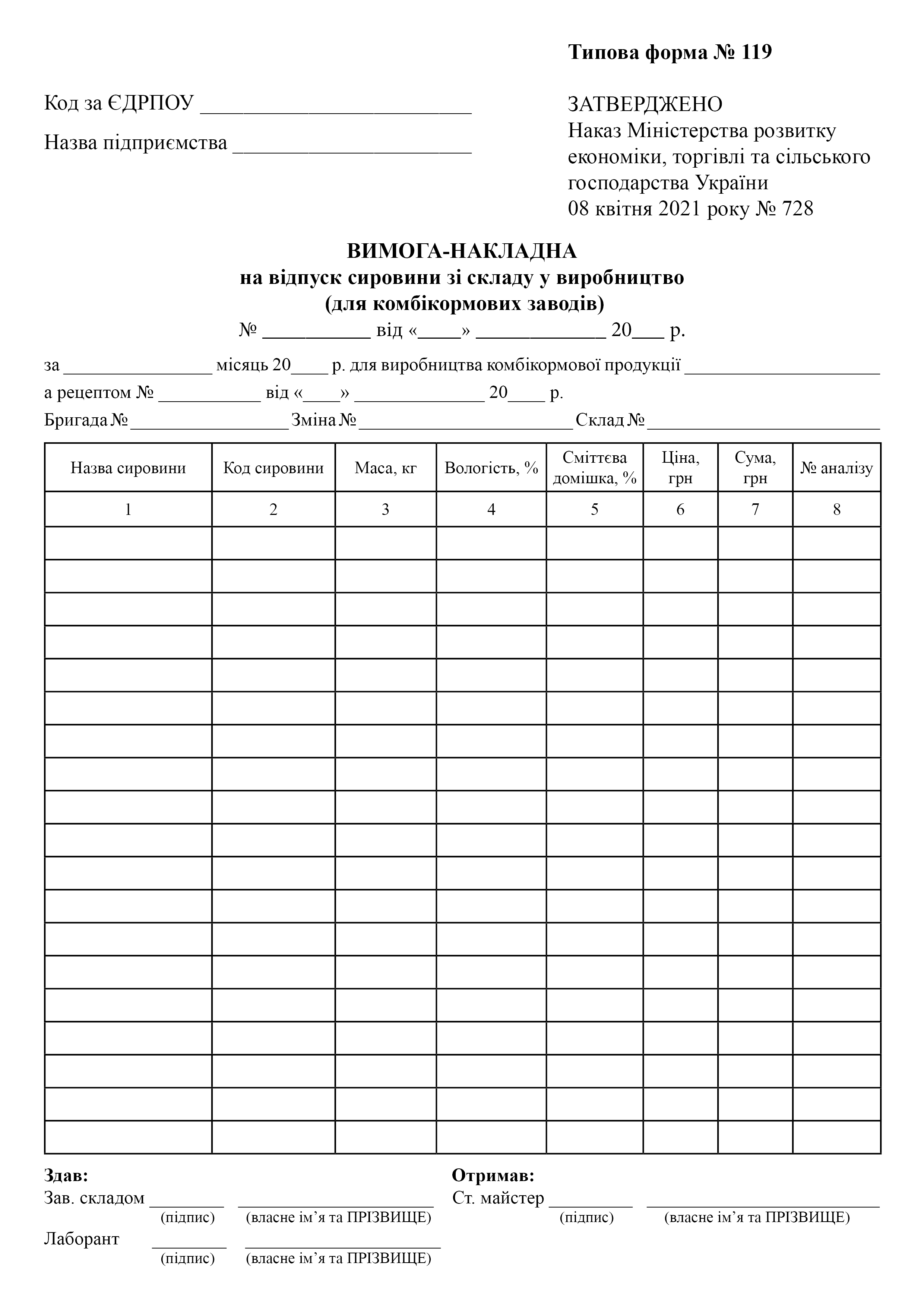 Вимога-накладна на відпуск сировини зі складу у виробництво (для комбікормових заводів).