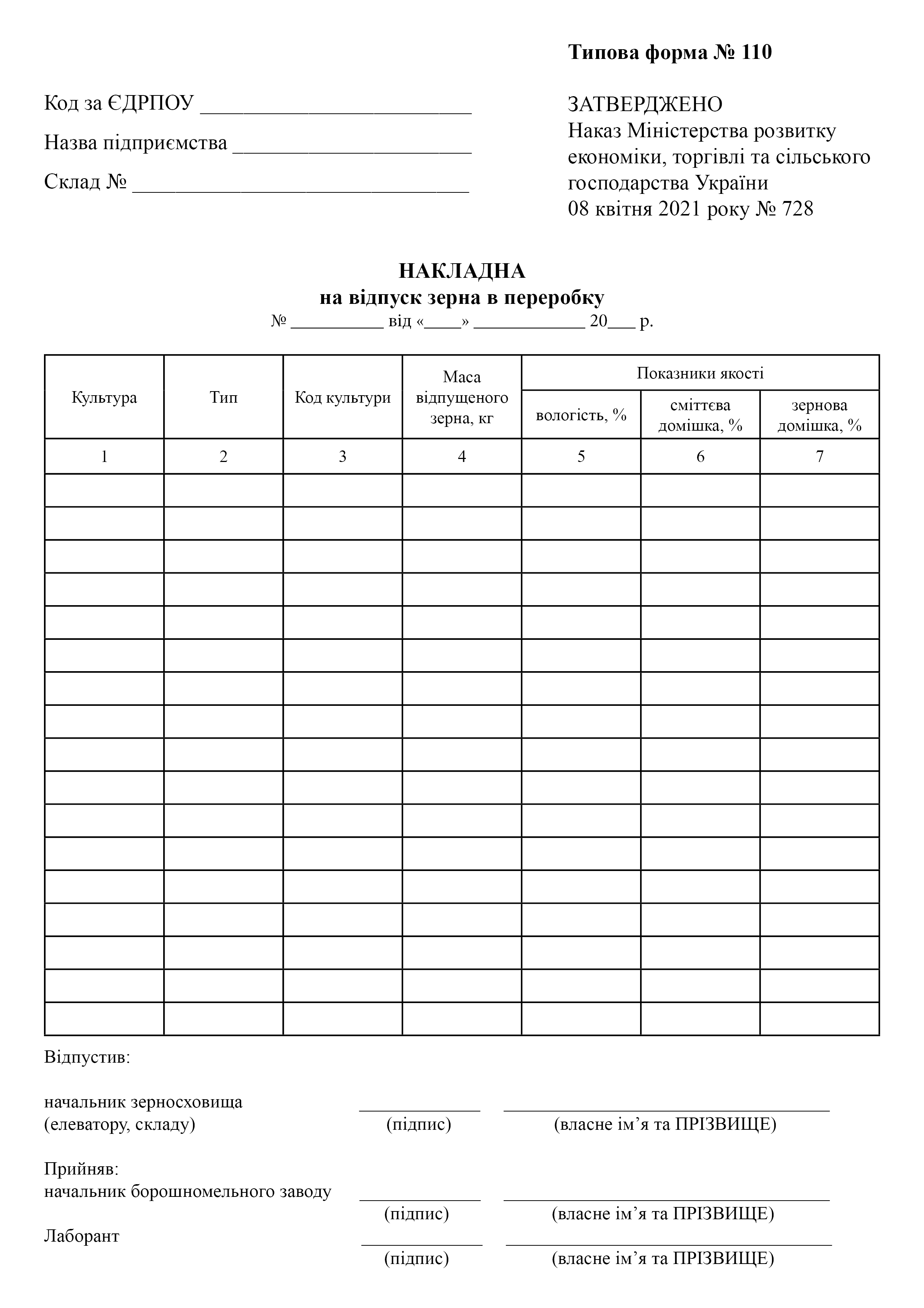 Накладна на відпуск зерна в переробку.