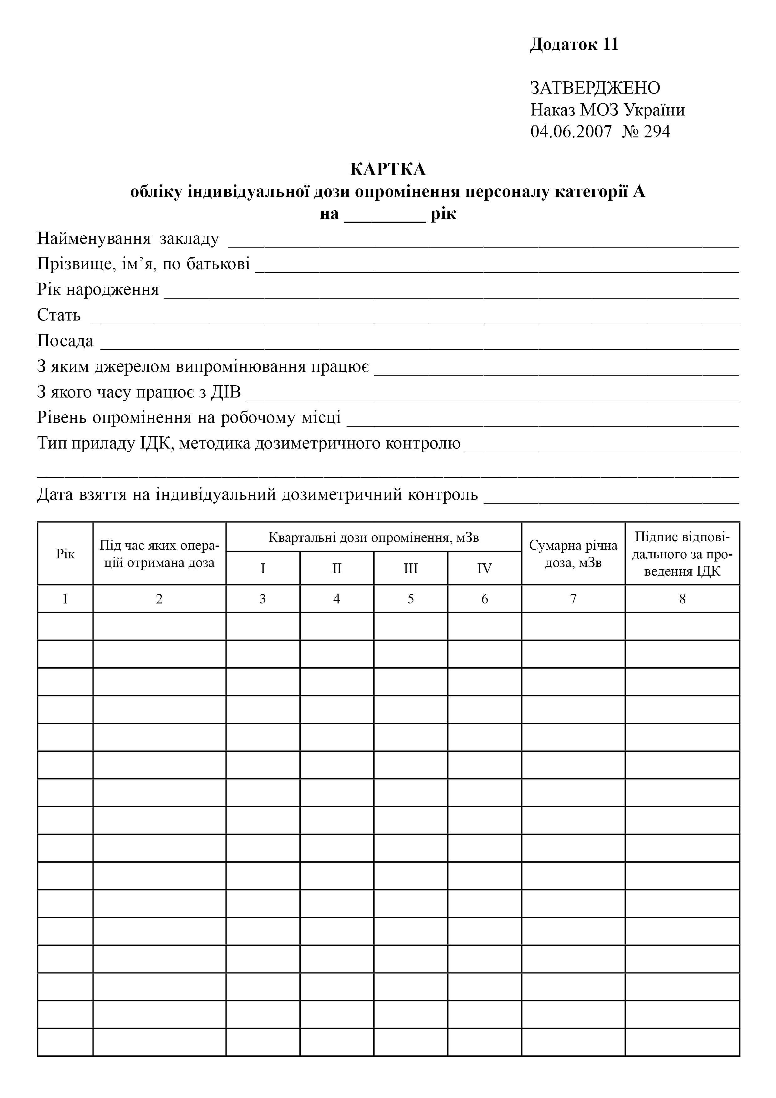 Карта обліку індивідуальної дози опромінення персоналу категорії А.