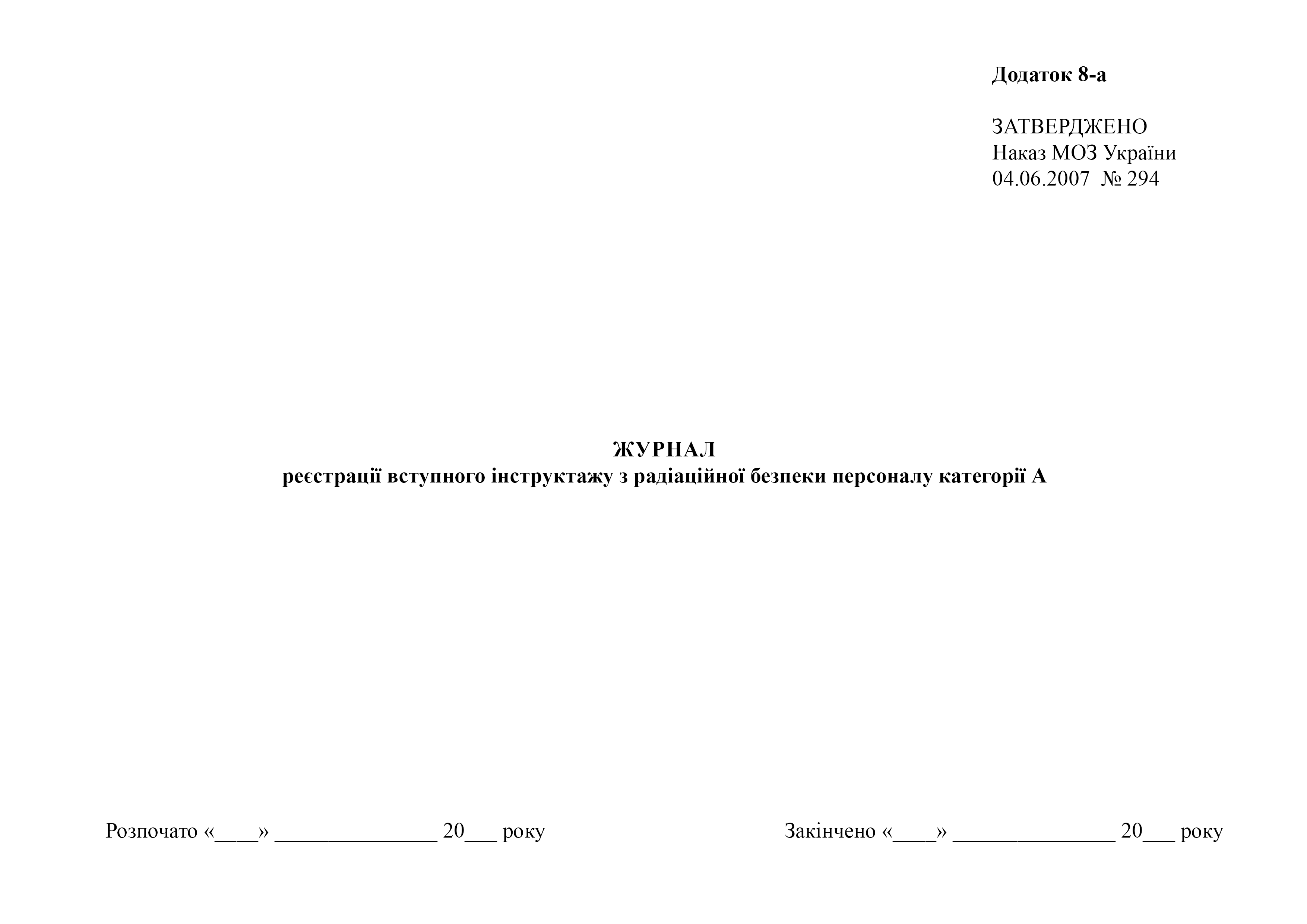 Журнал реєстрації вступного інструктажу з радіаційної безпеки персоналу категорії А.