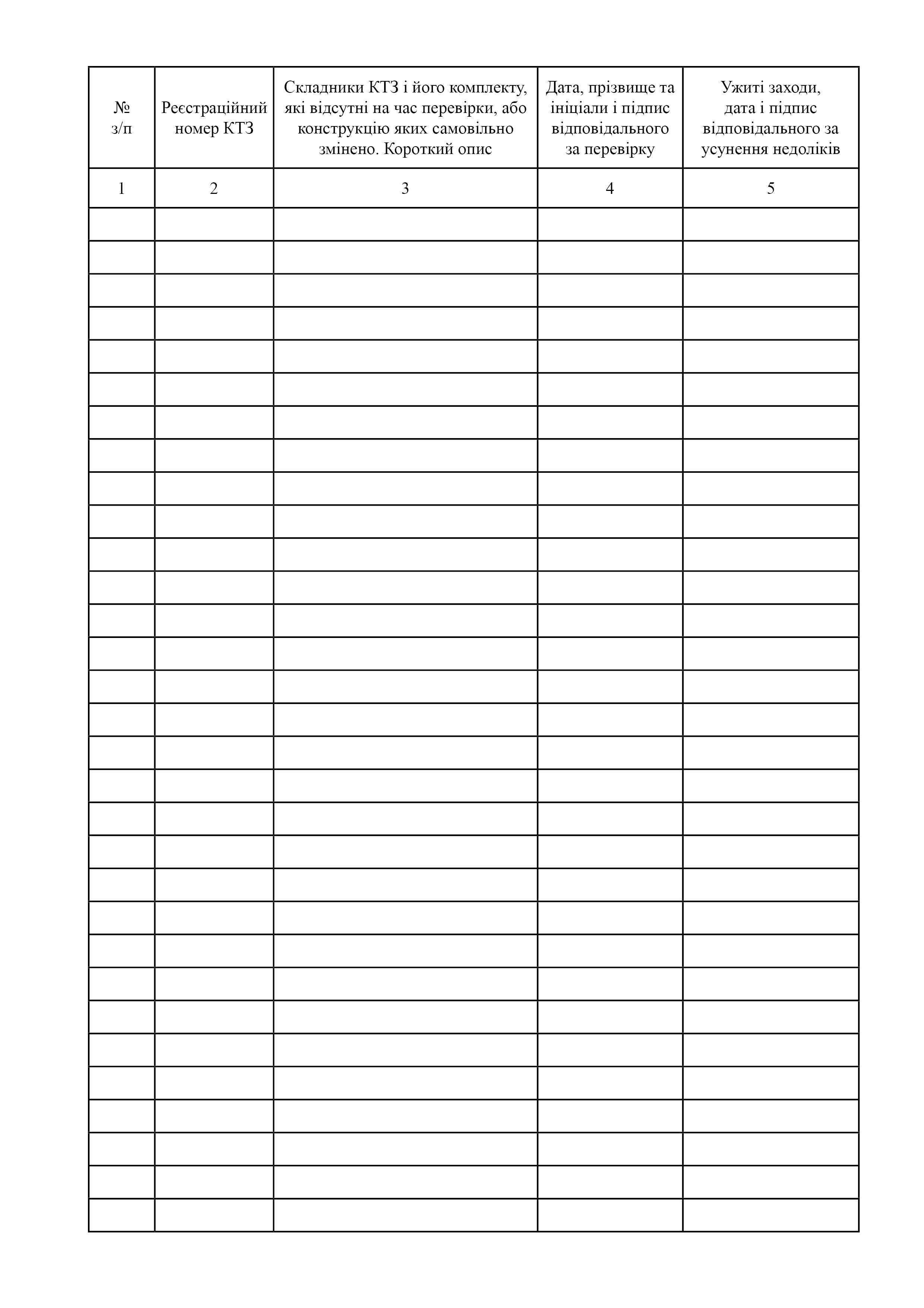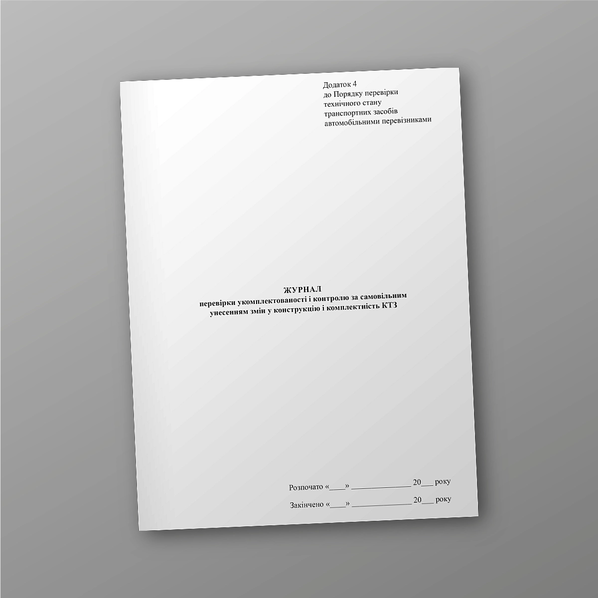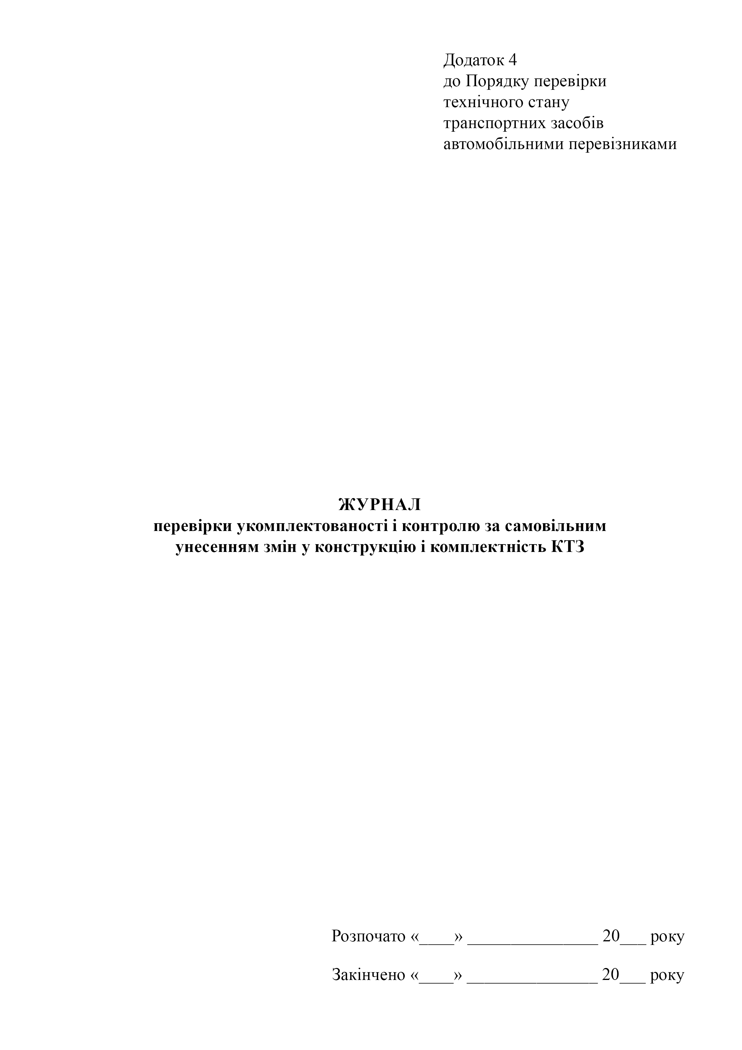 Журнал перевірки укомплектованості і контролю за самовільним знесенням змін у конструкцію і комплектність КТЗ.