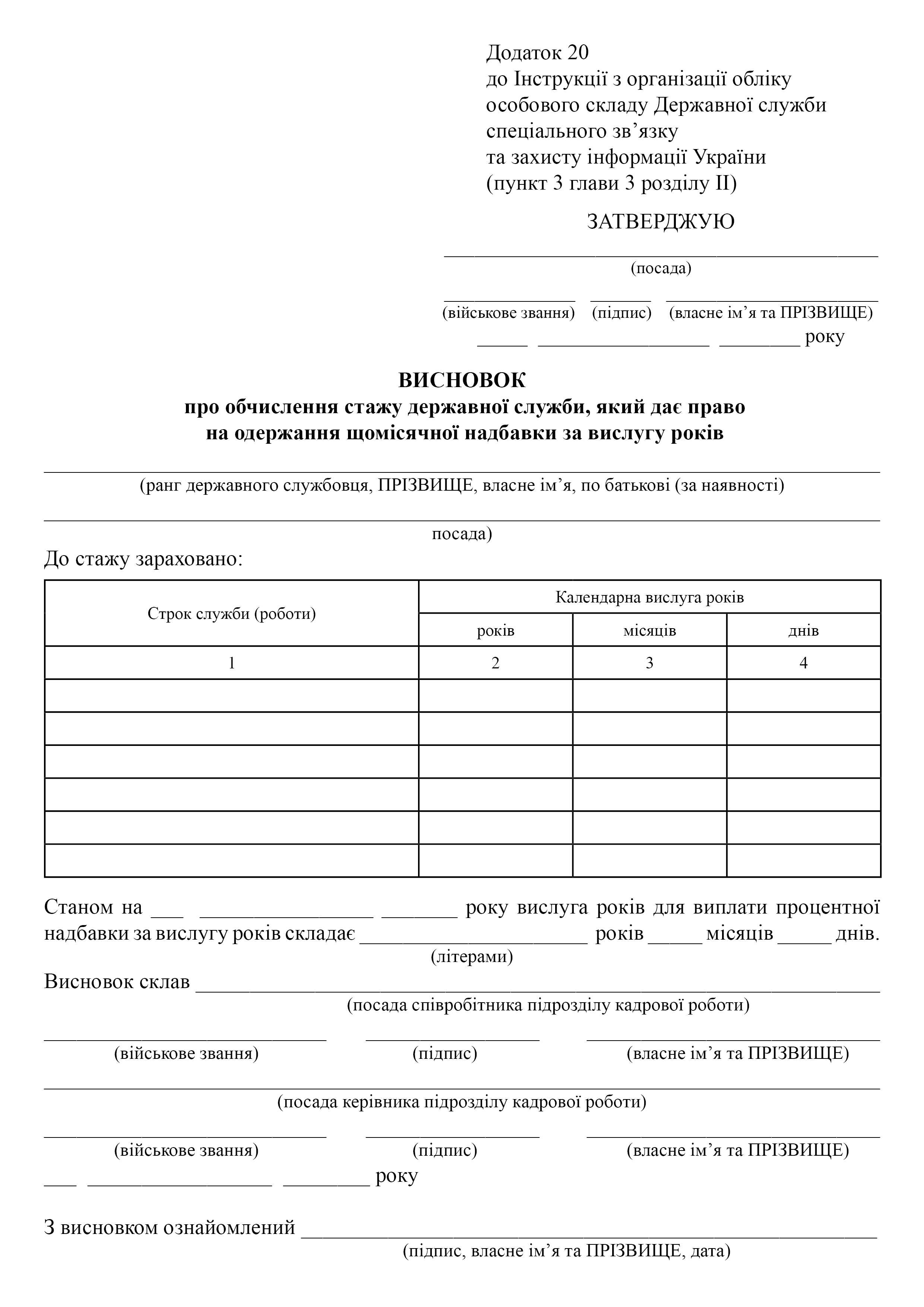 Висновок про обчислення стажу державної служби, який дає право на одержання щомісячної надбавки за вислугу років.