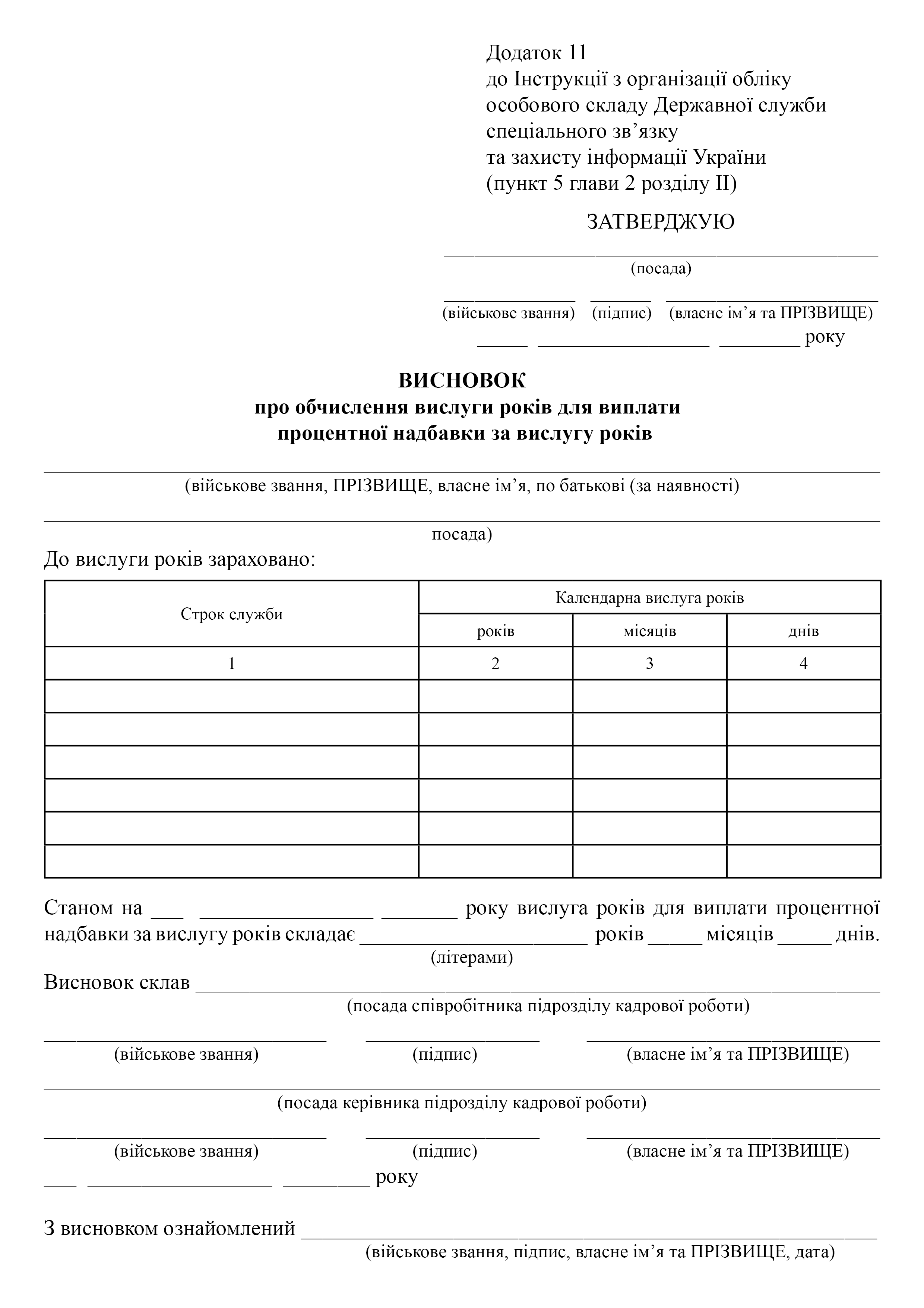 Висновок про обчислення вислуги років для виплати процентної надбавки за вислугу років.
