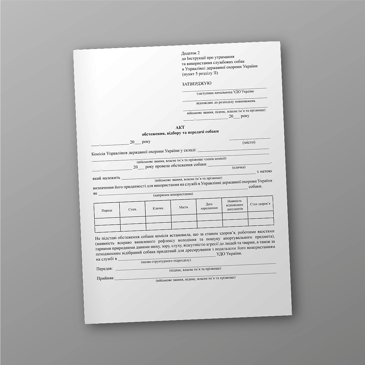 Акт обстеження, відбору та передачі собаки.