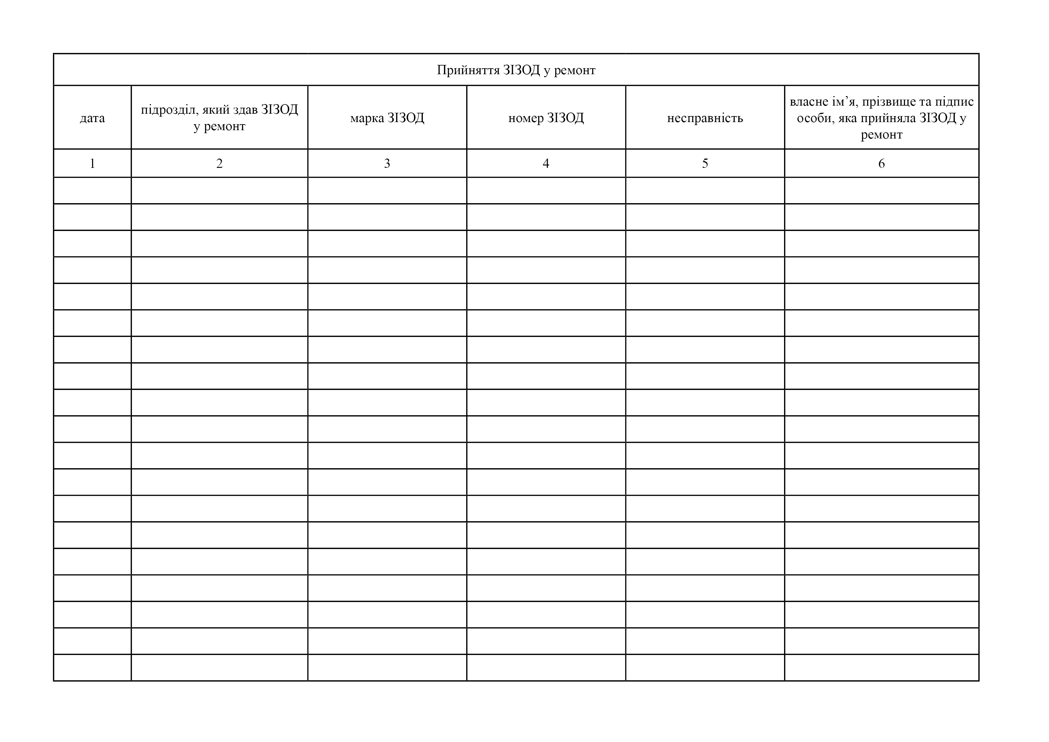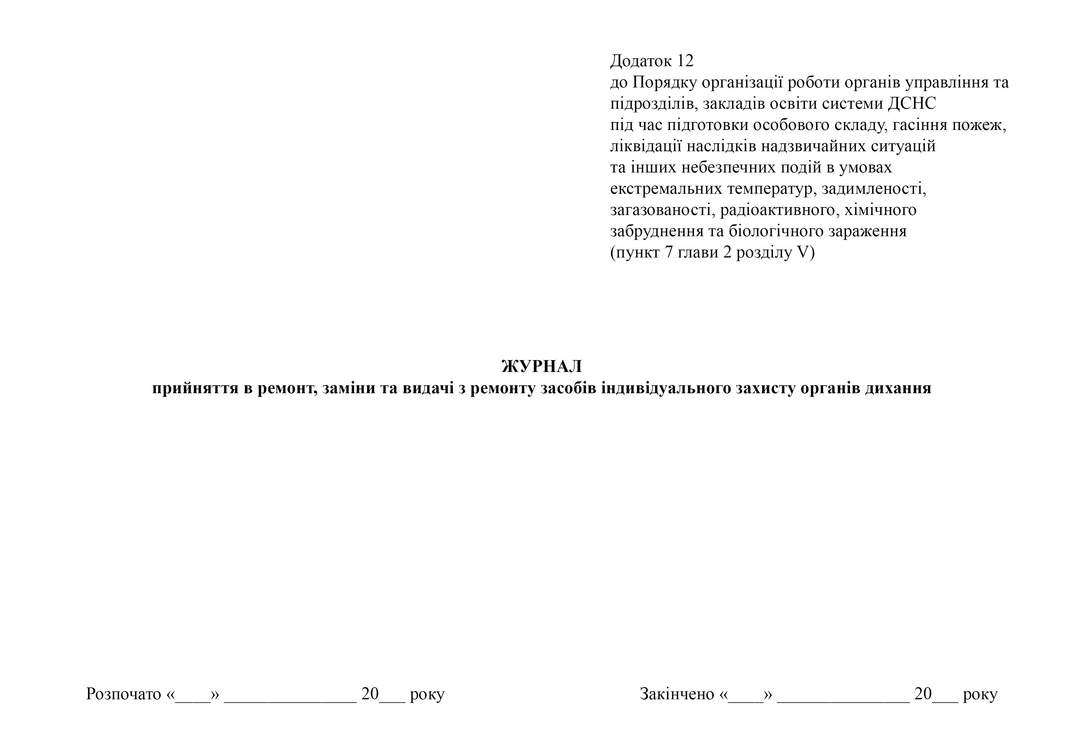 Журнал прийняття в ремонт, заміни та видачі з ремонту засобів індивідуального захисту органів дихання.