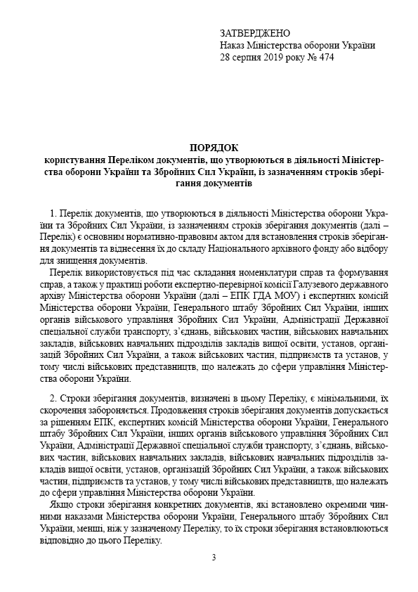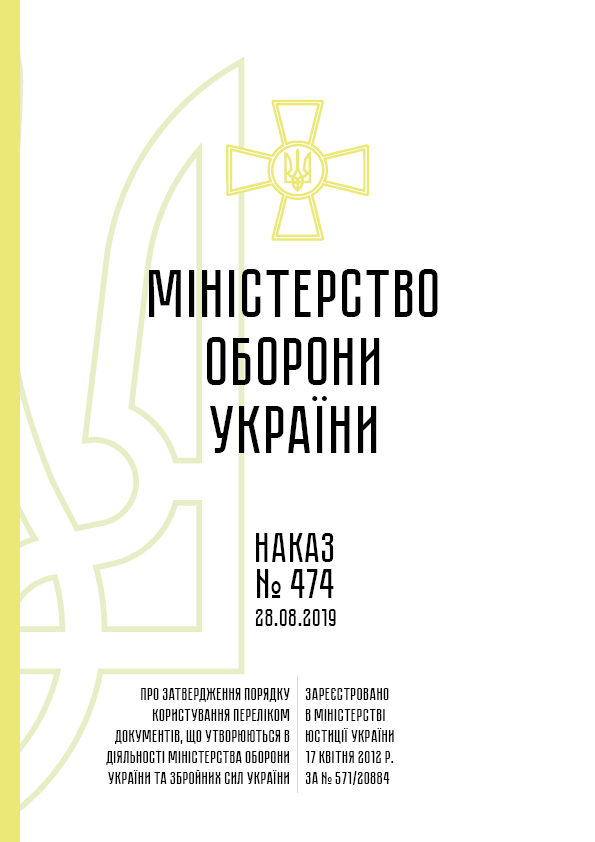 Наказ 474 + Додатки. Про затвердження Порядку користування Переліком документів, що утворюються в діяльності Міністерства оборони України та Збройних Сил України.