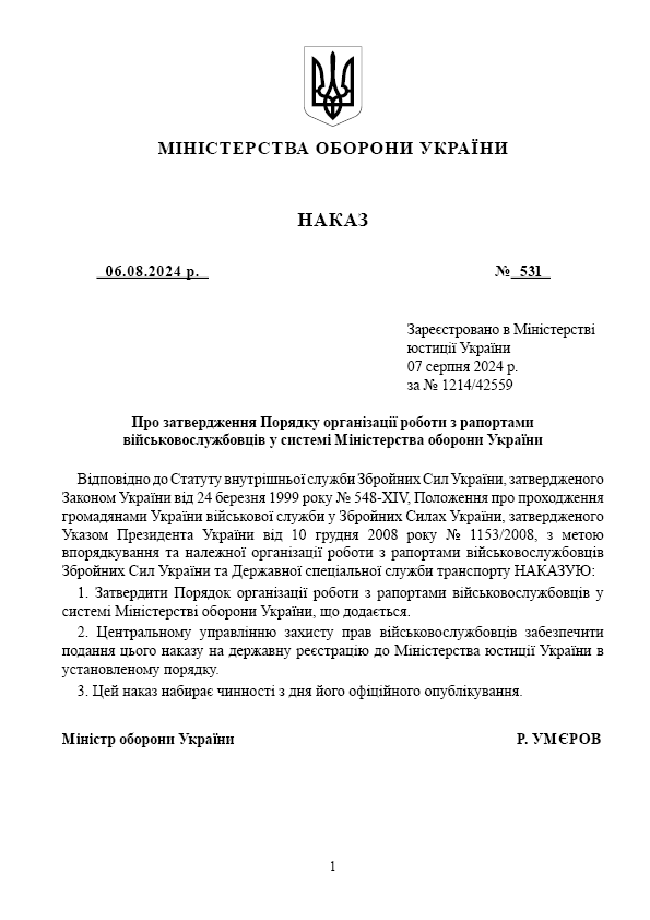 Наказ МОУ 531, зразки рапортів у ЗСУ.