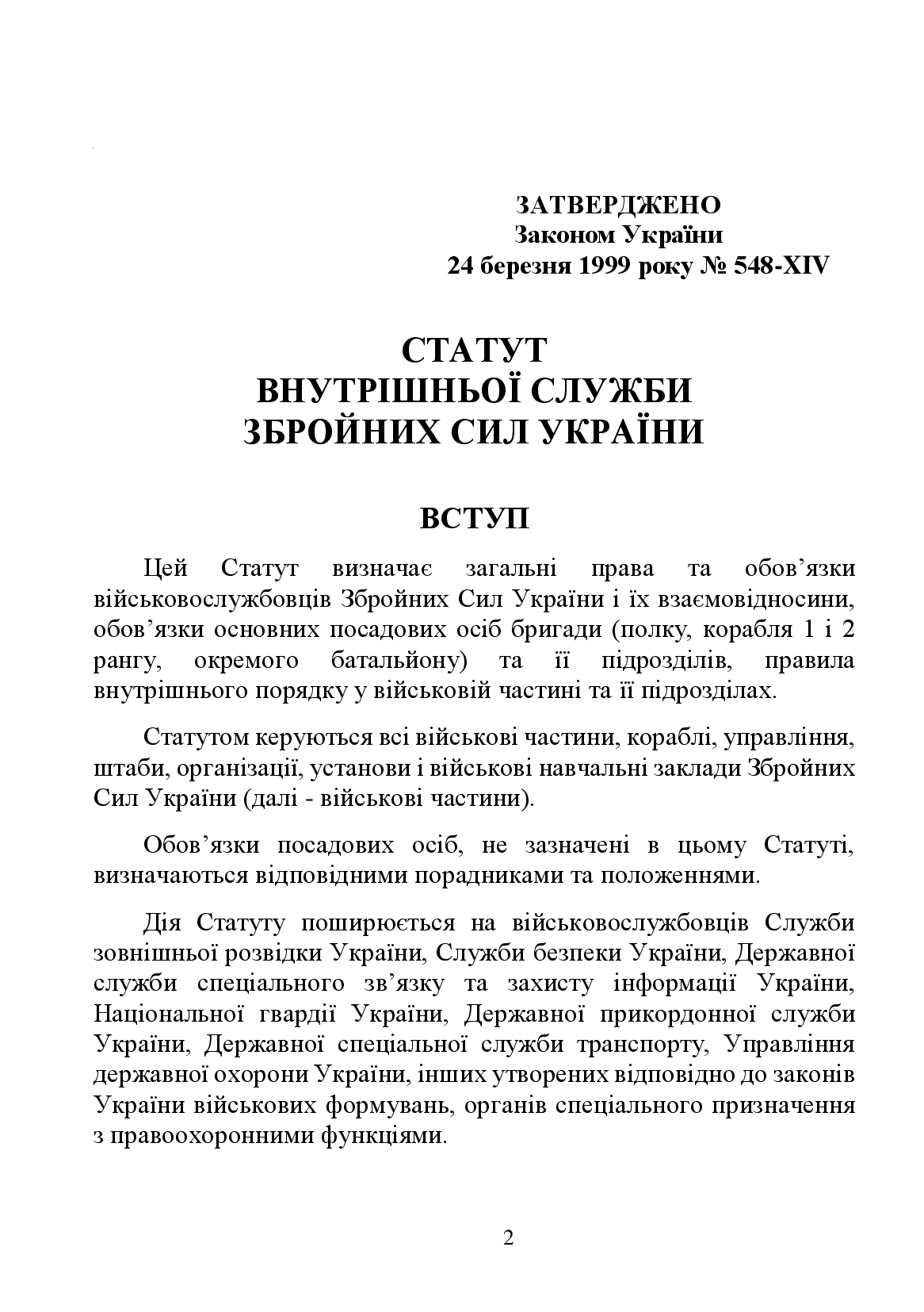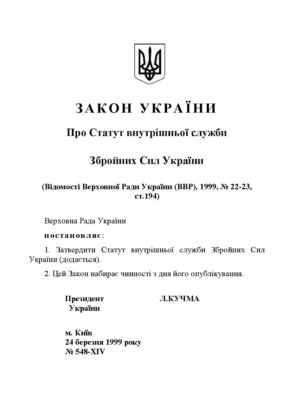 Закон Украины О Уставе внутренней службы Вооруженных Сил Украины.