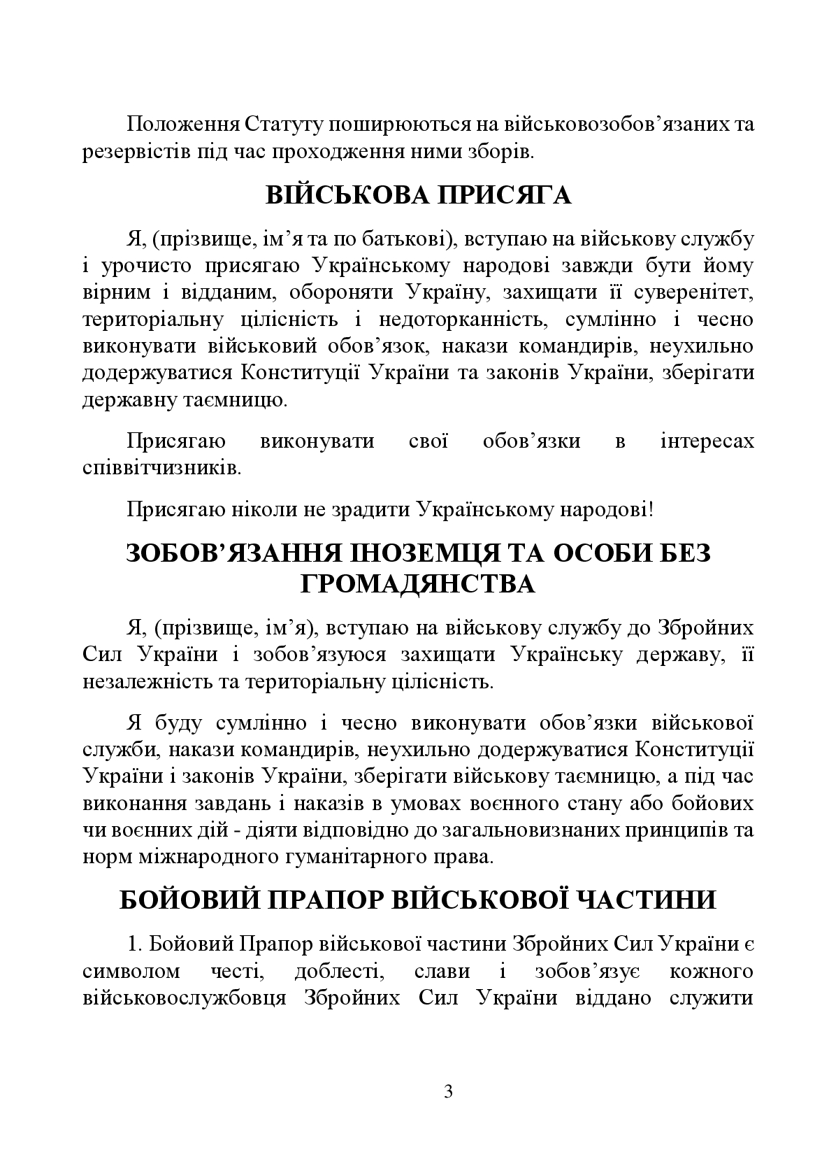Я, (фамилия, имя и отчество), вступаю на военную службу и торжественно присягаю Украинскому народу всегда быть ему верным и преданным, защищать Украину, защищать ее суверенитет, территориальную целостность и неприкосновенность, добросовестно и честно выполнять воинскую обязанность, приказы командиров, неукоснительно соблюдать Конституцию Украины и законы Украины.