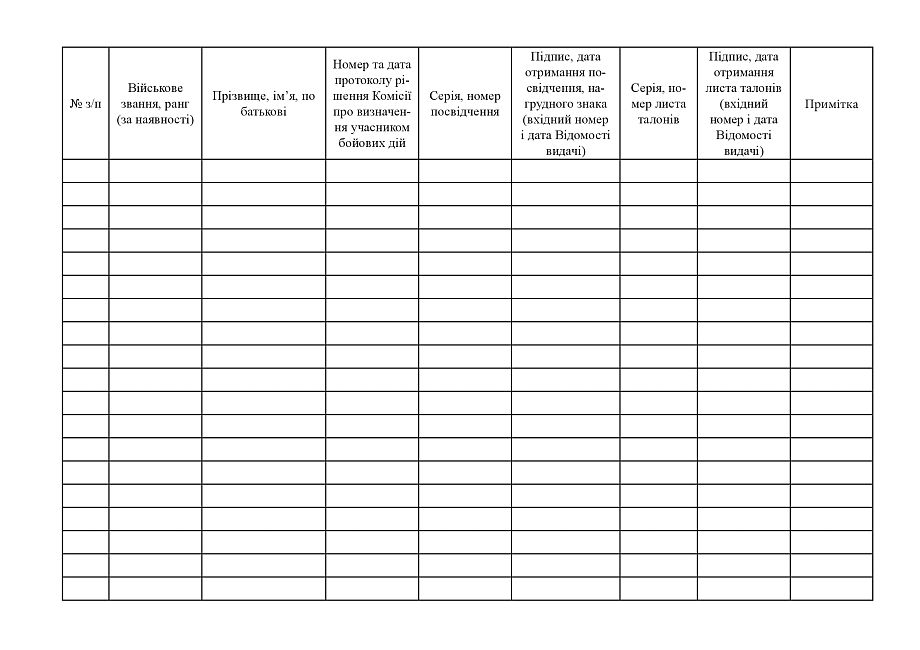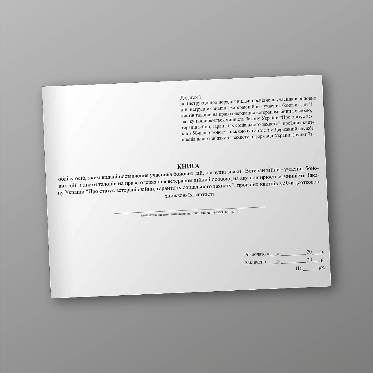Книга учета лиц, которым выданы удостоверения участника боевых действий, нагрудные знаки "Ветеран войны - участник боевых действий" и письма талонов на право получения ветераном войны и лицом, на которое распространяется действие Закона Украины "О статусе ветеранов" войны, гарантии их социальной защиты”, проездных билетов с 50-процентной скидкой их стоимости.