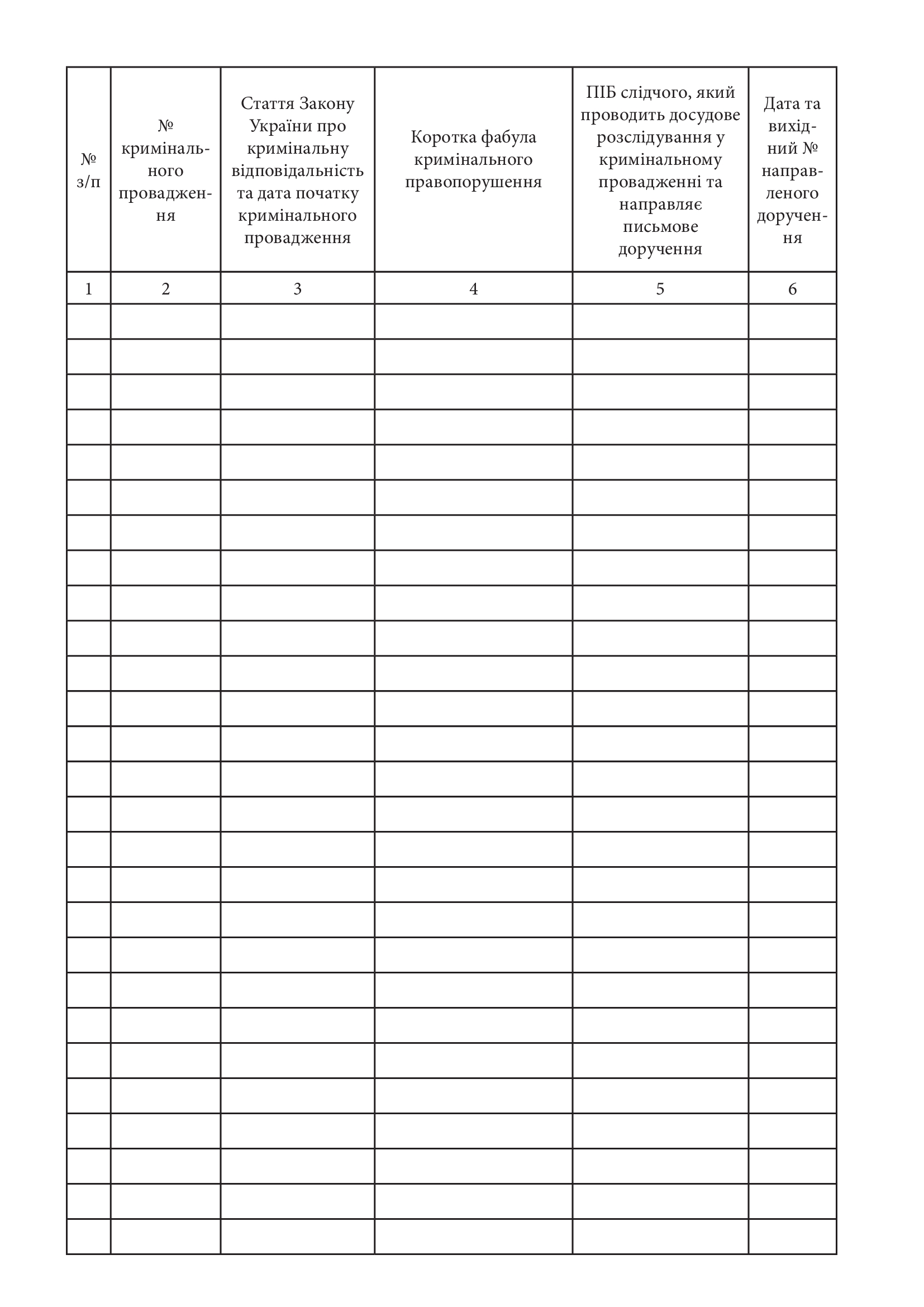 Журнал учета выполнения оперативными и другими подразделениями письменных поручений следователей, предоставленных в уголовных производствах о проведении следственных (розыскных) действий и негласных следственных (розыскных) действий.