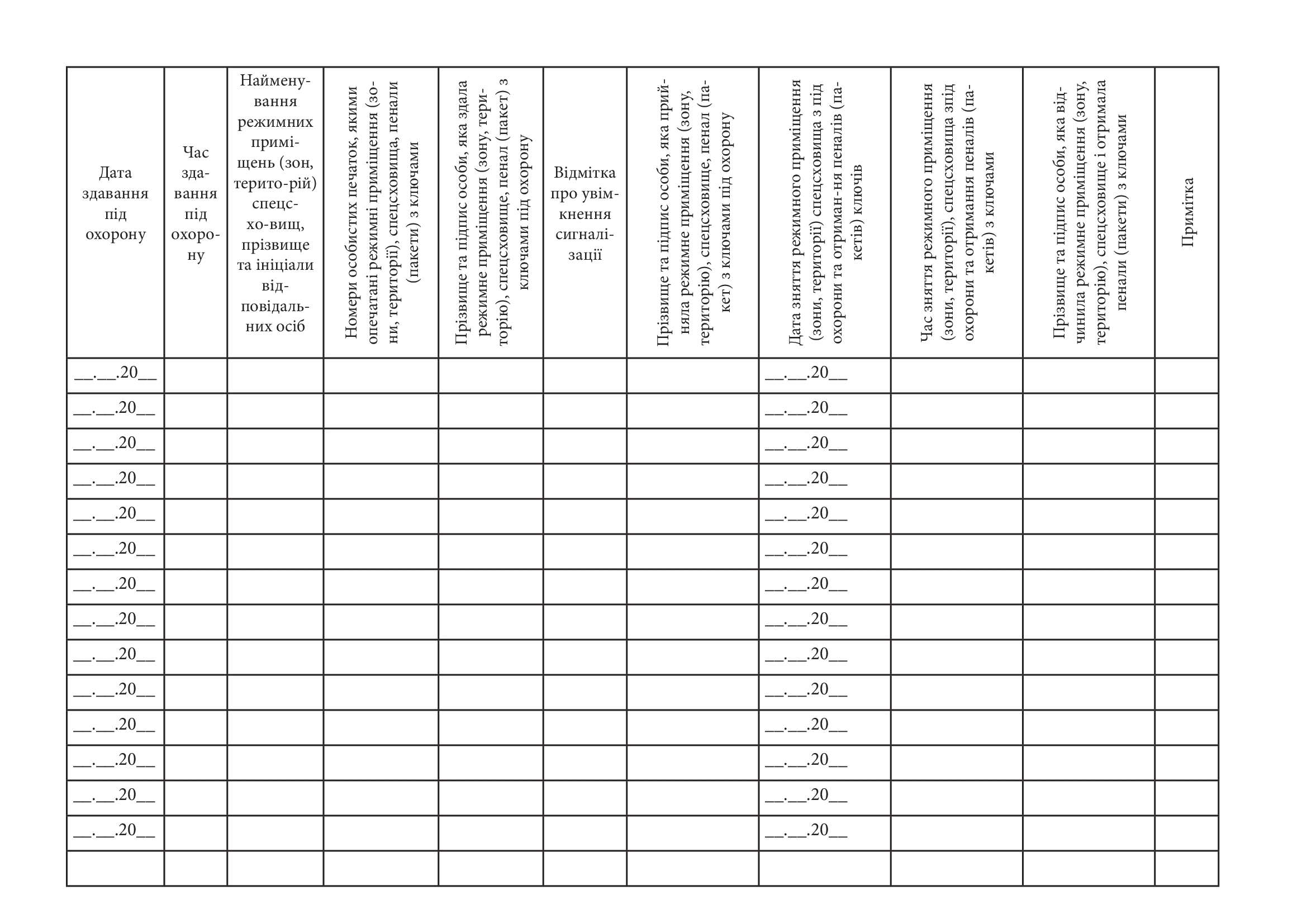 Журнал сдачи (приемки) под охрану, снятие (приемка) из-под охраны режимных помещений (зон, территории), хранилищ материальных носителей секретной информации и ключей от них.