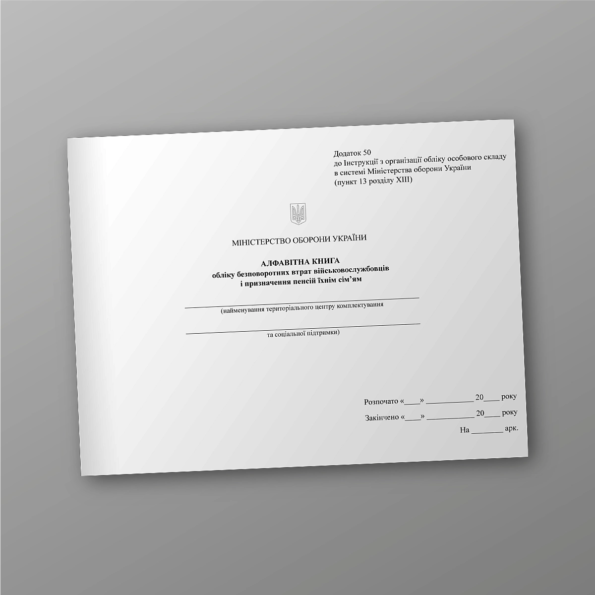 Алфавитная Книгу учета безвозвратных потерь военнослужащих и назначение пенсий их семьям Приложение 50 к Инструкции по организации учета личного состав в системе Министерства обороны Украины (пункт 13 раздела XIII).