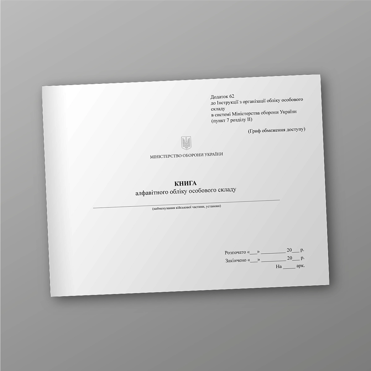Журнал или книга воинского учета может быть выполнена в мягкой или твердой обложке. Если Вы не нашли нужную книгу для ВСУ или количество страниц и прочее нужно сделать под вашу задачунапишіть нам на e-mail [email protected], мы обязательно свяжемся с Вами. Все военные журналы мы печатаем в соответствии с приказом МО Украины.