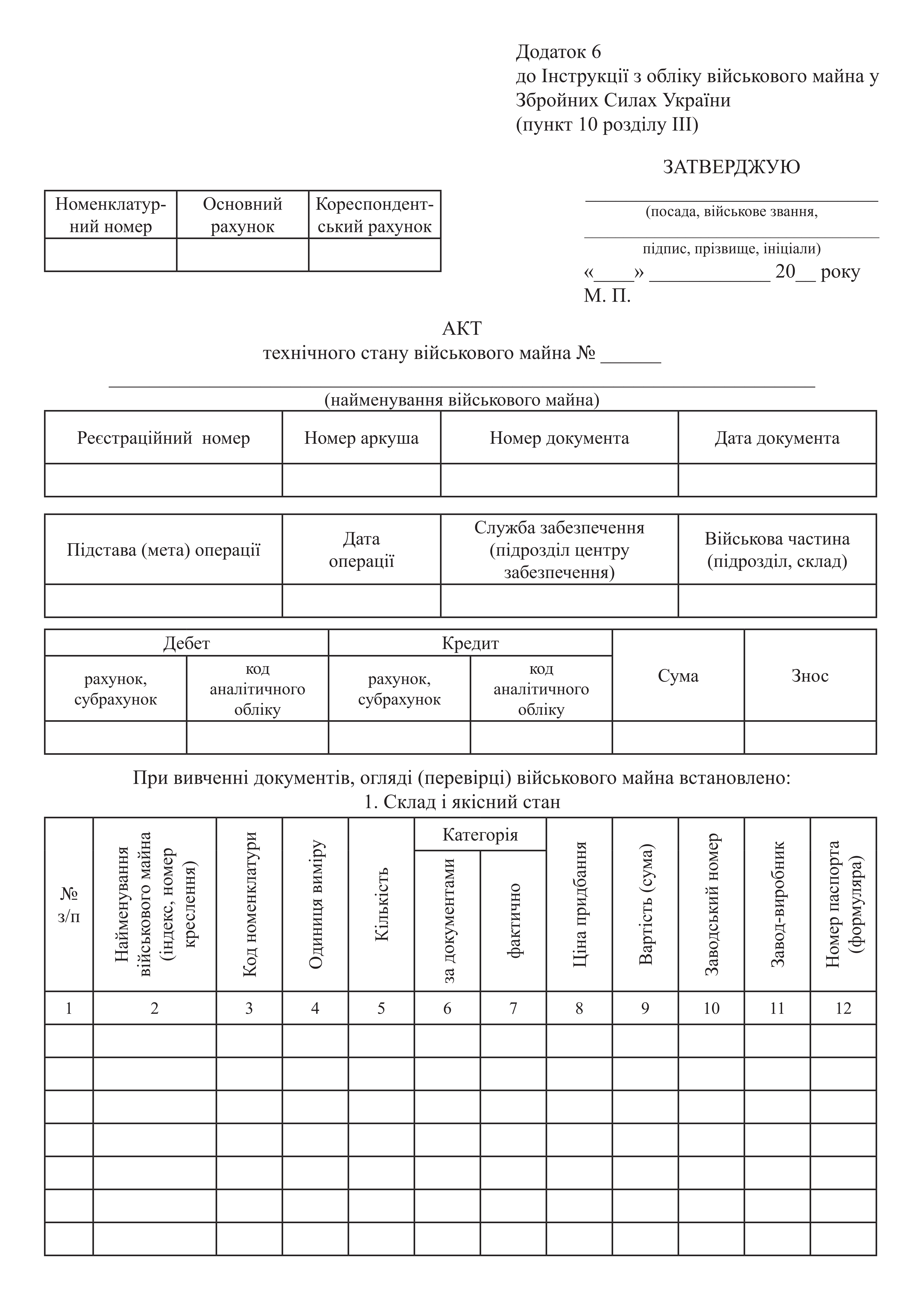 Приложение 6 (Новая редакция Приложение 7) к Инструкции по учету военного имущества Вооруженных силах Украины (пункт 10 раздела III).