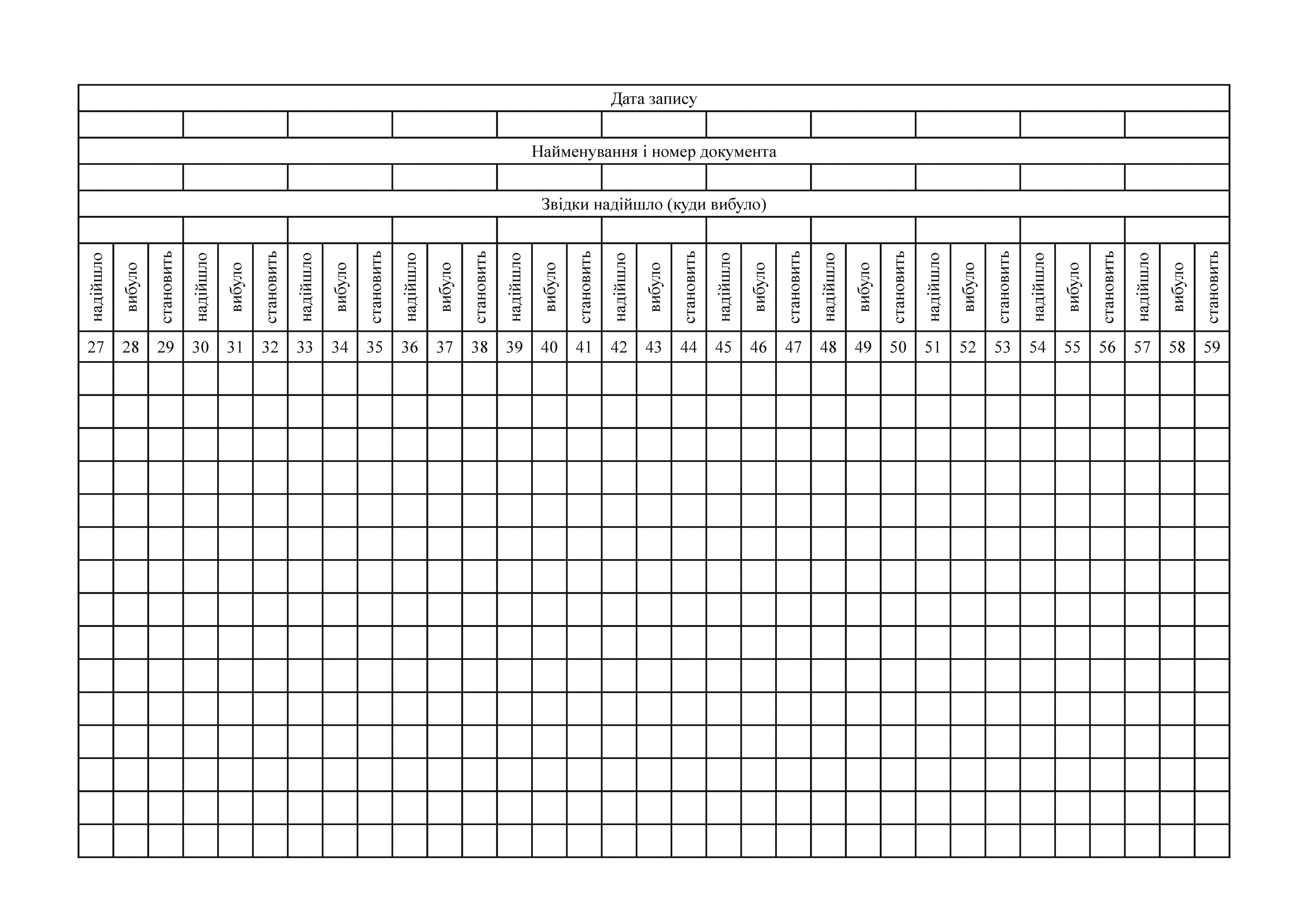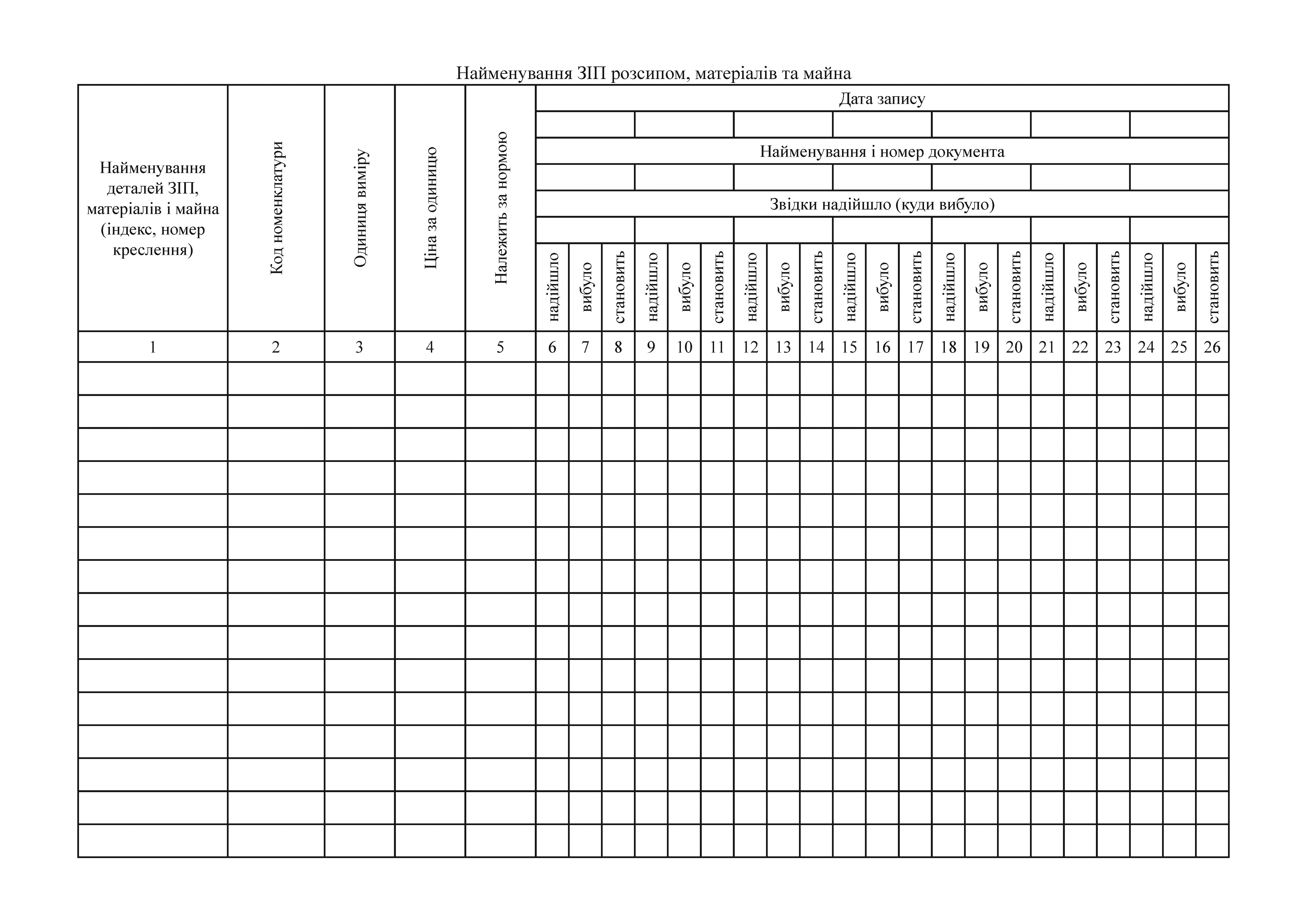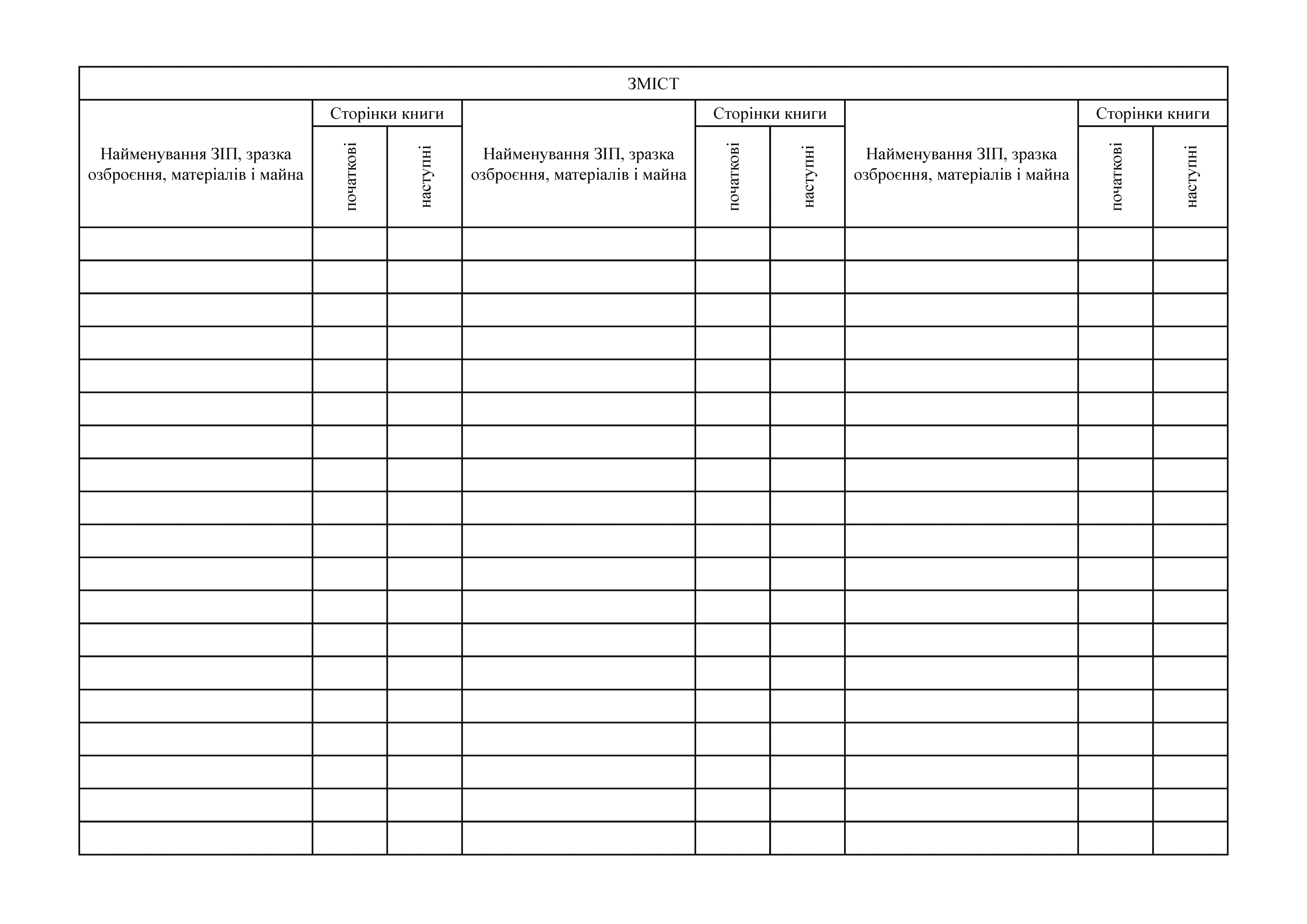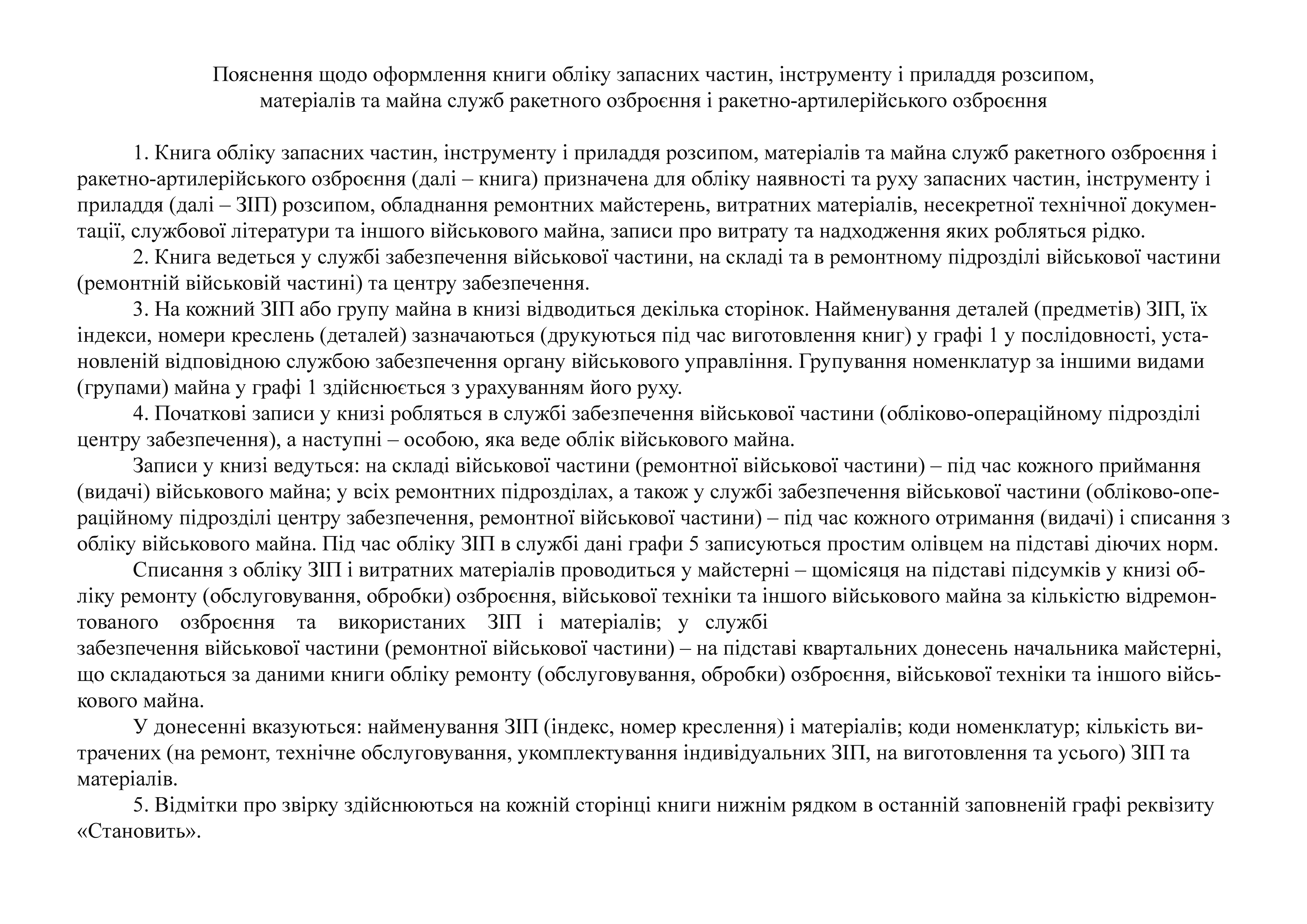 Книга учета запасных частей, инструмента и принадлежностей россыпью, материалов и имущества служб ракетного вооружения и ракетно-артиллерийского вооружения Приложение 14 (Новая редакция Приложение 15) к Инструкции по учету военного имущества в Вооруженных Силах Украины (пункт 12 раздела IV) .