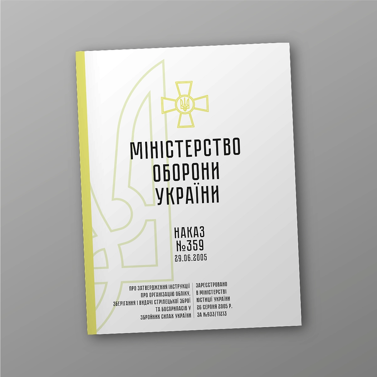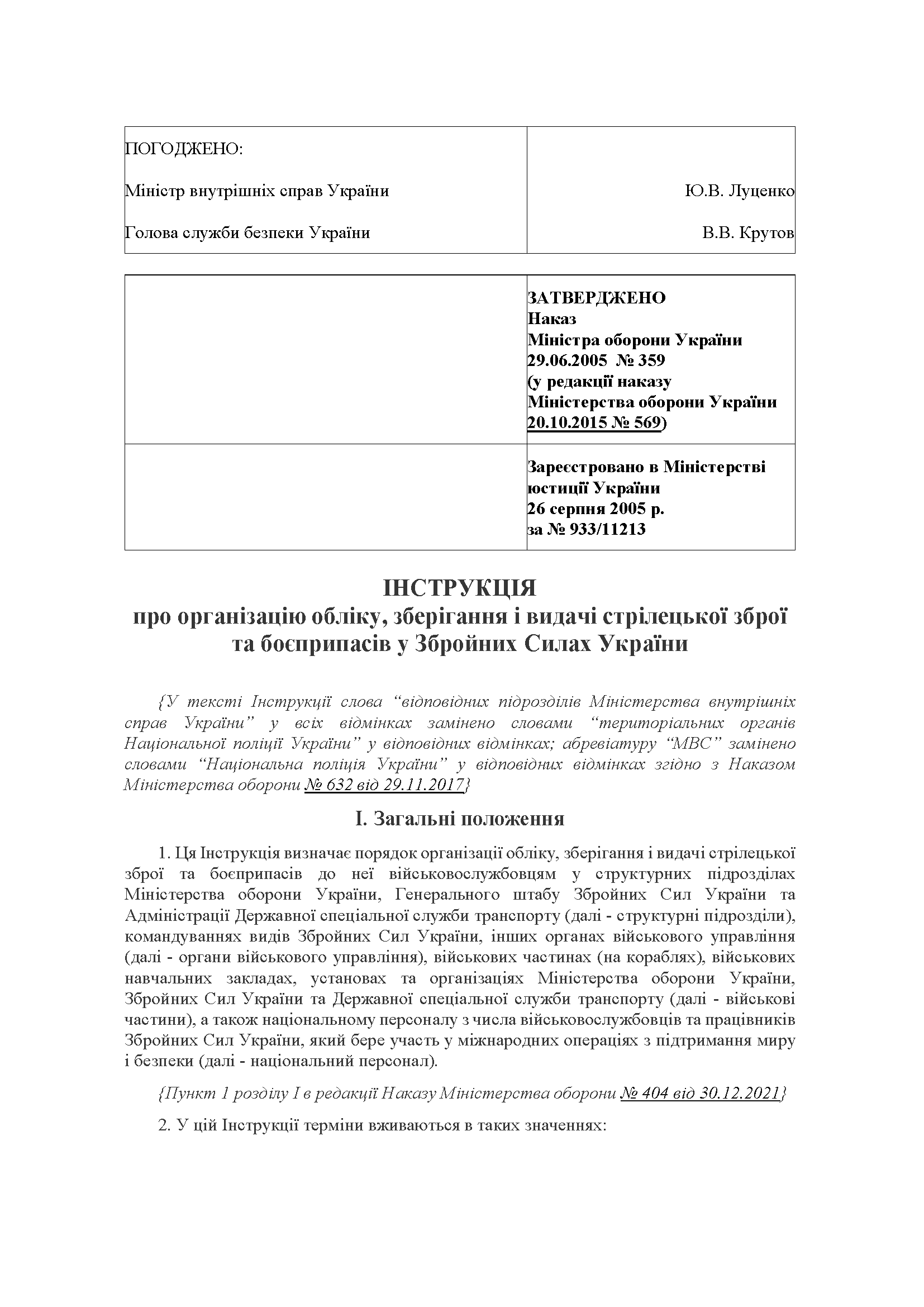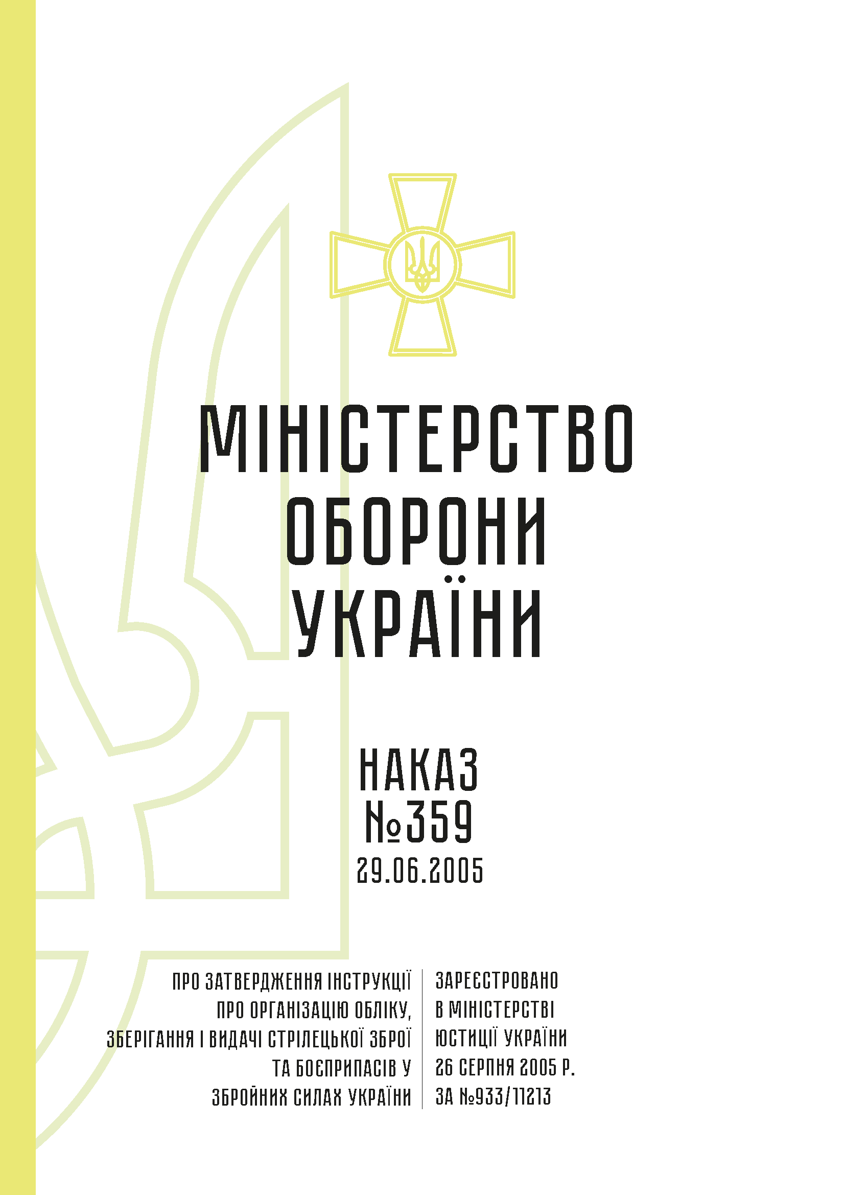 Приказ 359+ Приложения. Об утверждении Инструкции об организации учета, хранения и выдачи стрелкового оружия и боеприпасов в Вооруженных Силах Украины Министра обороны Украины 29.06.2005 № 359 Зарегистрировано в Министерстве юстиции Украины 26 августа 2005 г.