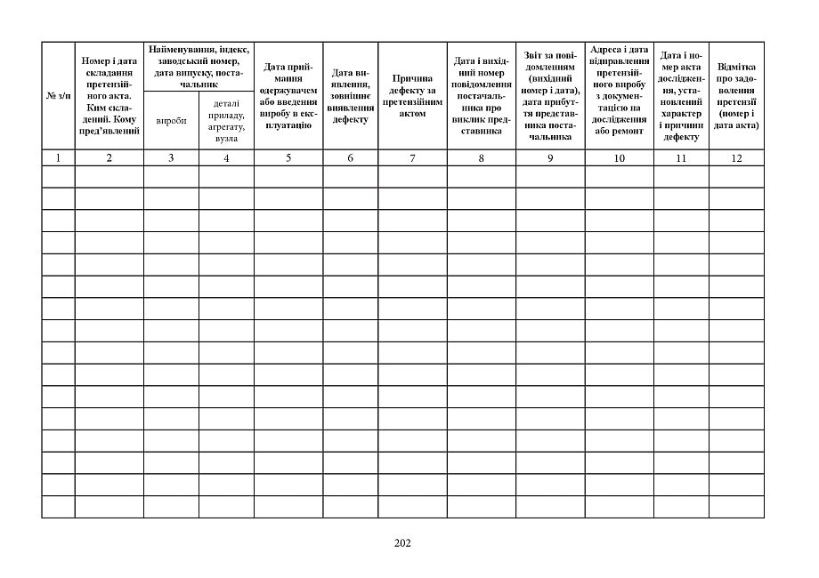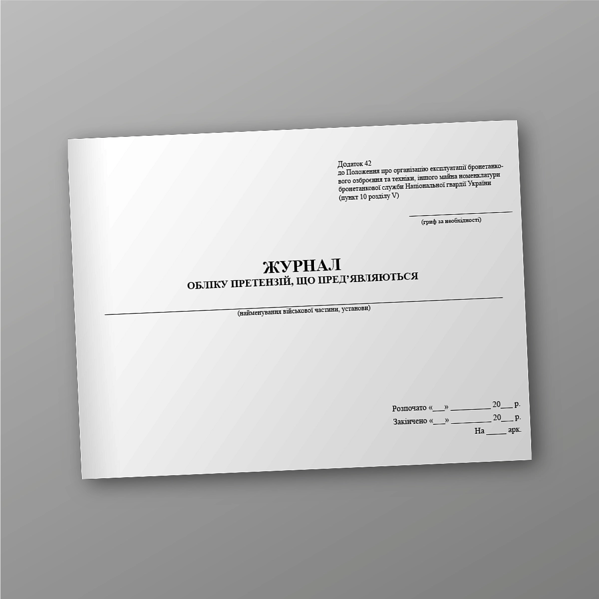 Журнал учета предъявляемых претензий Приложение 42 к Положению об организации эксплуатации бронетано- вого вооружения и техники, другого имущества номенклатуры бронетанковой службы Национальной гвардии Украины (пункт 10 раздела V).Альбомная ориентация.