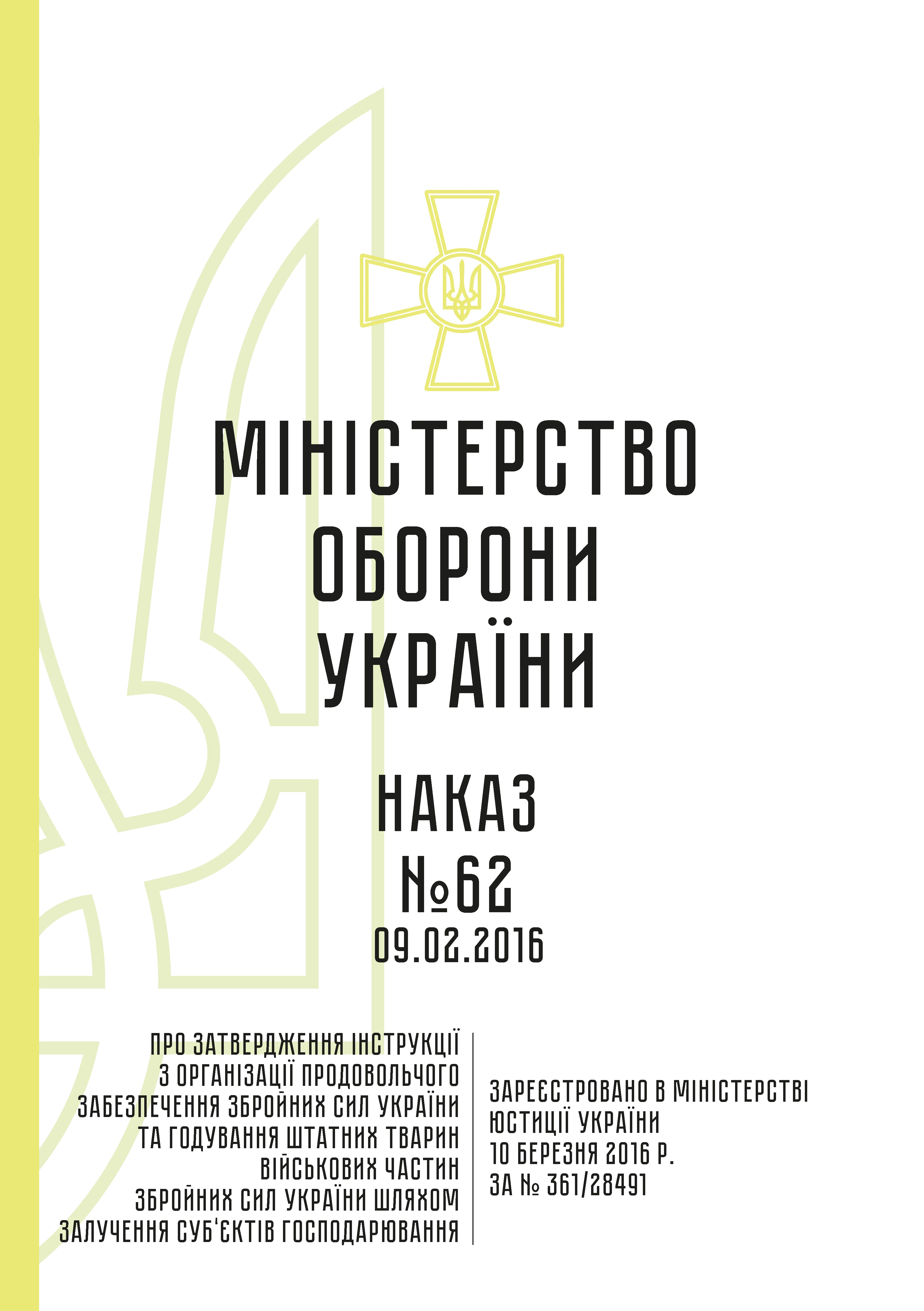Приказ 62 + Приложения. Об утверждении Инструкции по организации продовольственного обеспечения Вооруженных Сил Украины и кормления штатных животных воинских частей Вооруженных Сил Украины путем привлечения субъектов хозяйствования .