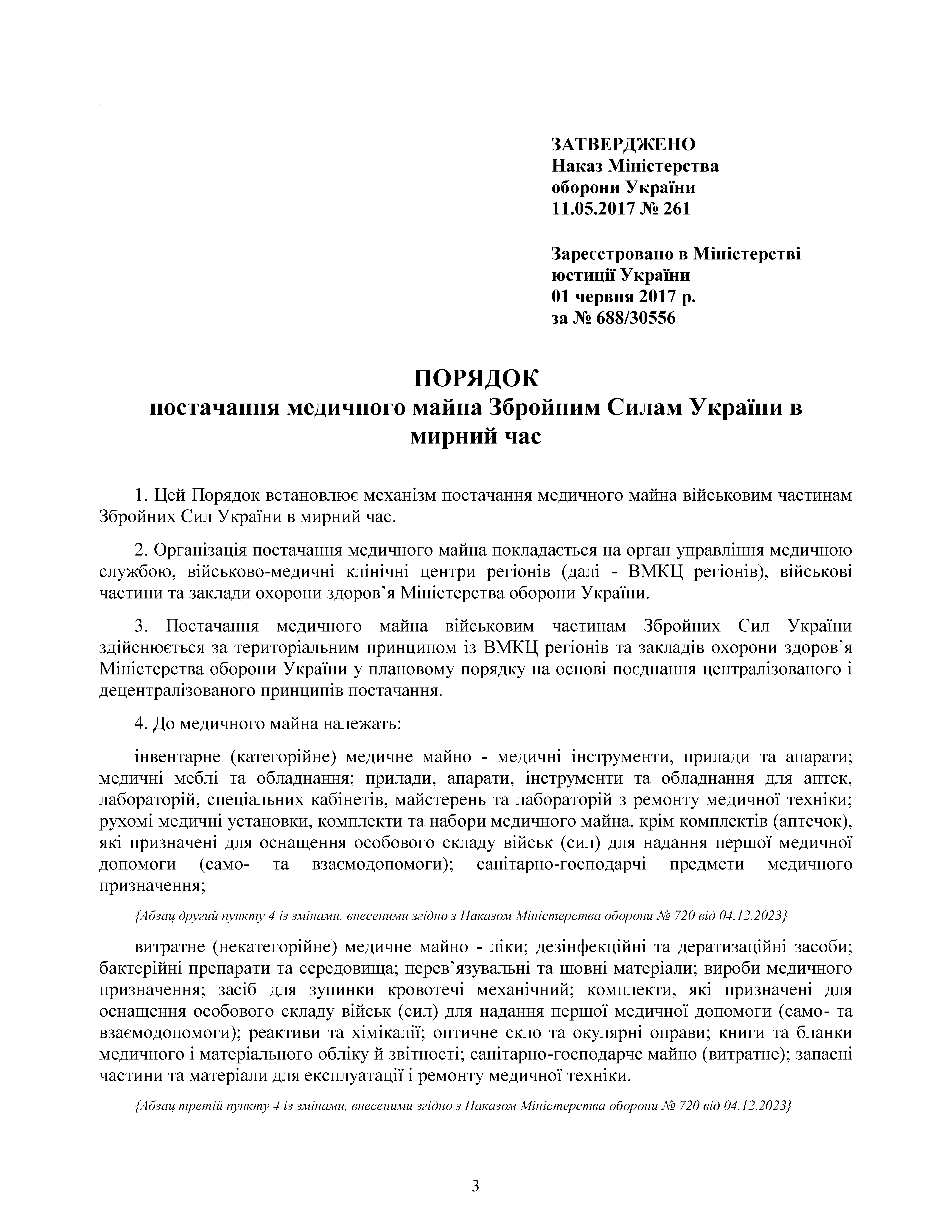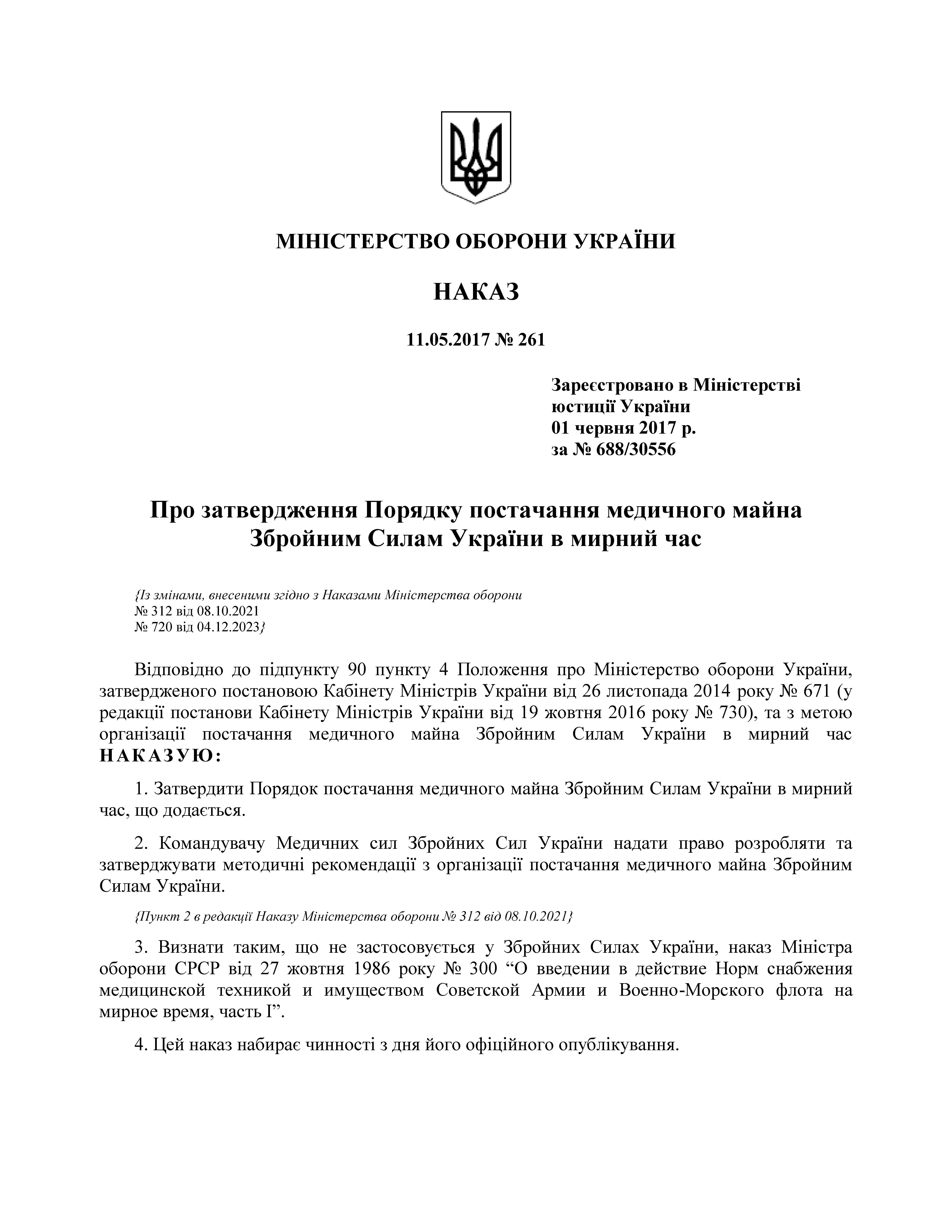 Приказ 261. Об утверждении Порядка поставки медицинского имущества ВСУ в мирное время.