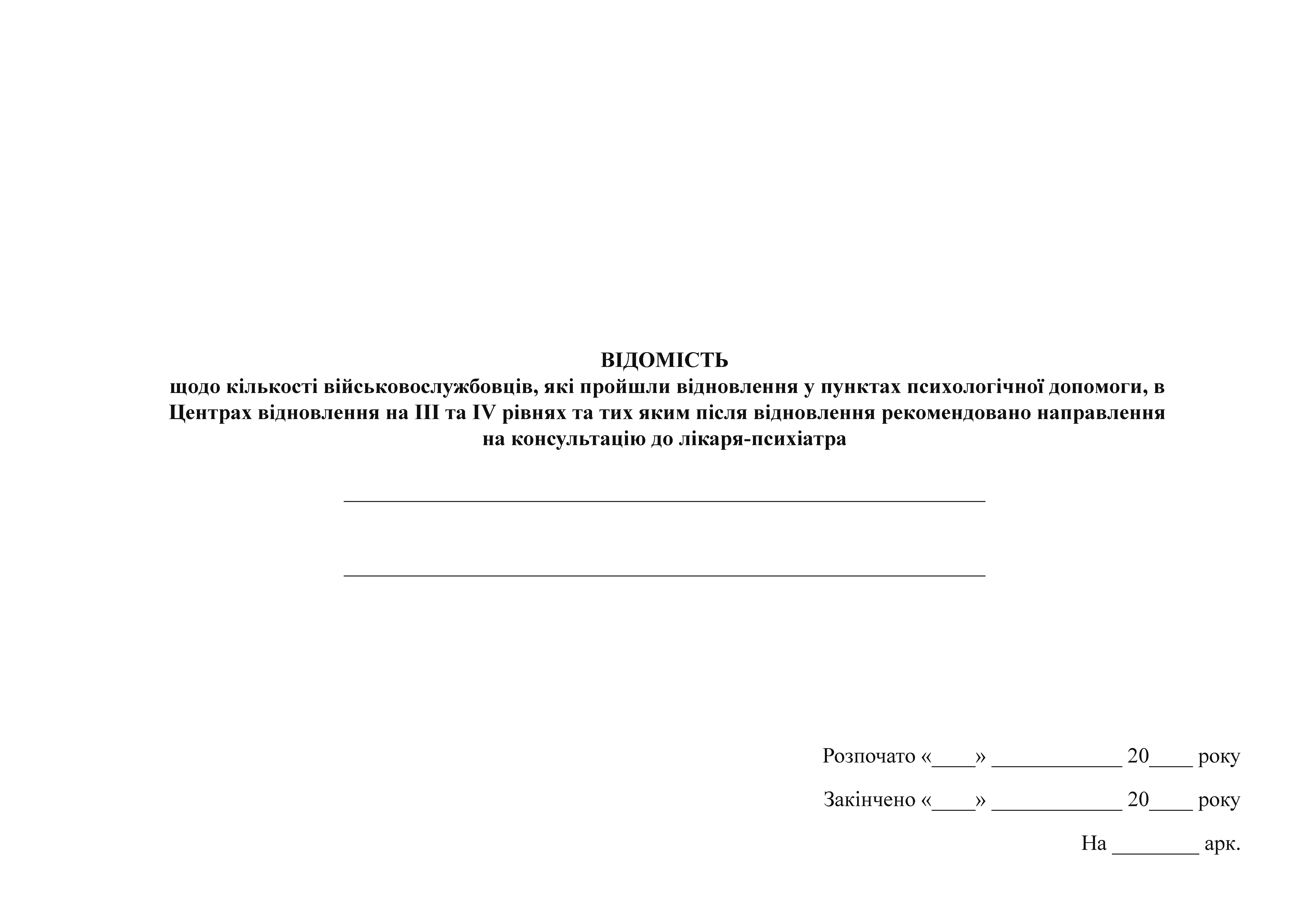 Ведомость о количестве военнослужащих, прошедших восстановление в пунктах психологической помощи, в Центрах восстановления на III и IV уровнях и тех после восстановления рекомендовано направление на консультацию к врачу-психиатру.