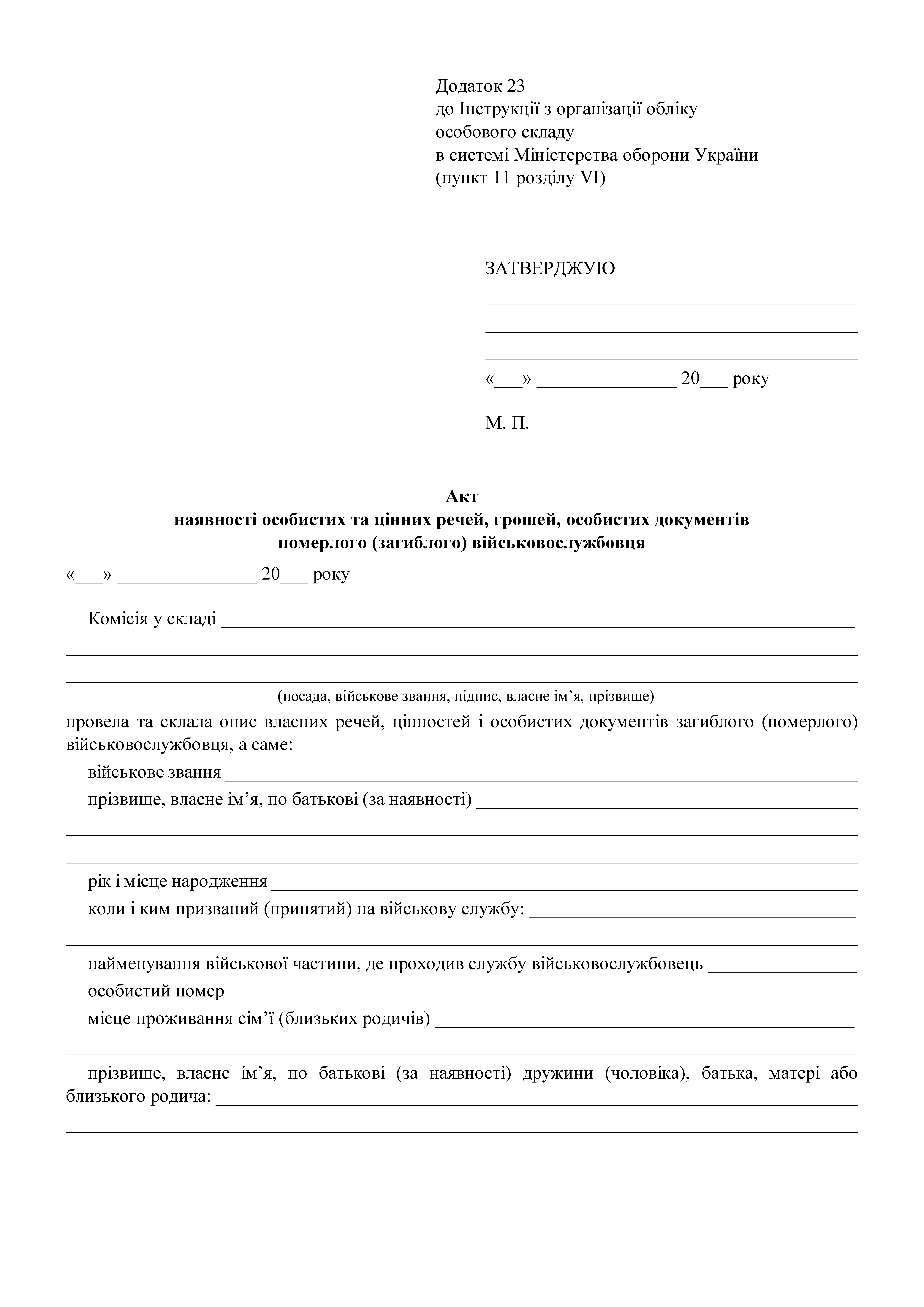 Акт наличия личных и ценных вещей, денег, личных документов умершего (погибшего) военнослужащего.