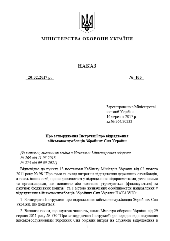 Приказ МОУ 105 об утверждении Инструкции о командировках военнослужащих ВСУ.